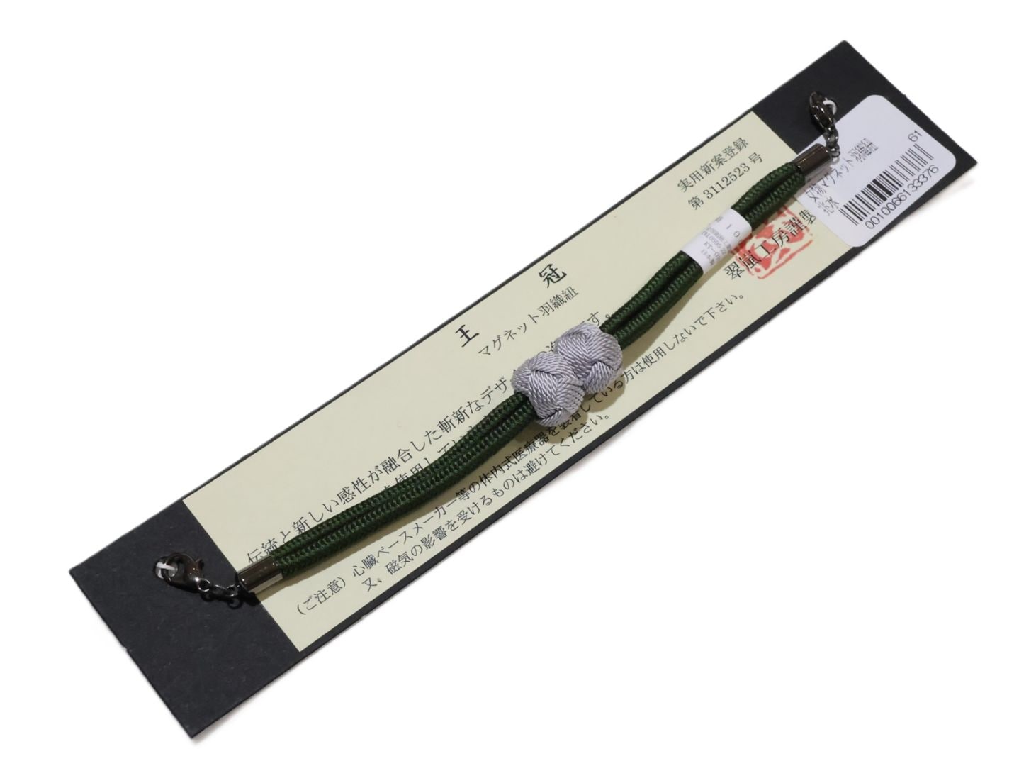マグネットタイプ羽織紐「深い抹茶色の組紐にグレー色の小田巻」