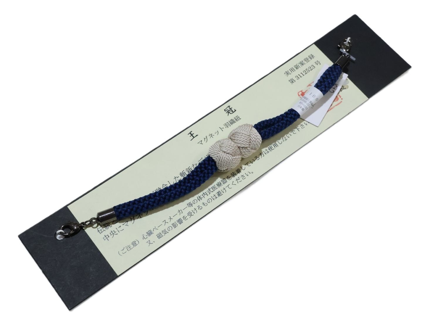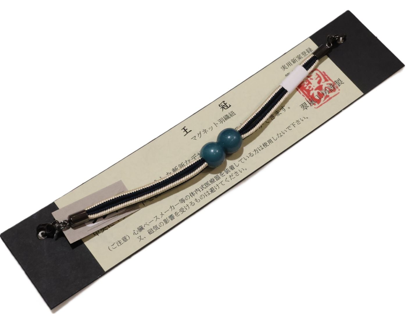 マグネットタイプ羽織紐「紺色と薄ベージュ色の組紐に青緑色のラクト玉」