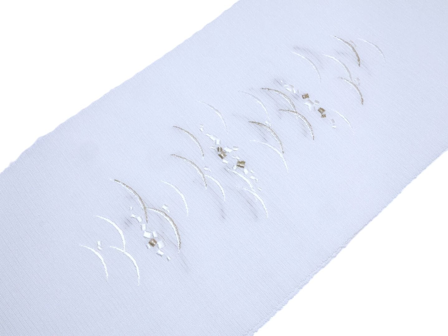 ・夏物正絹刺繍半衿「白色の地に白色と薄金色のつゆしばの刺繍」