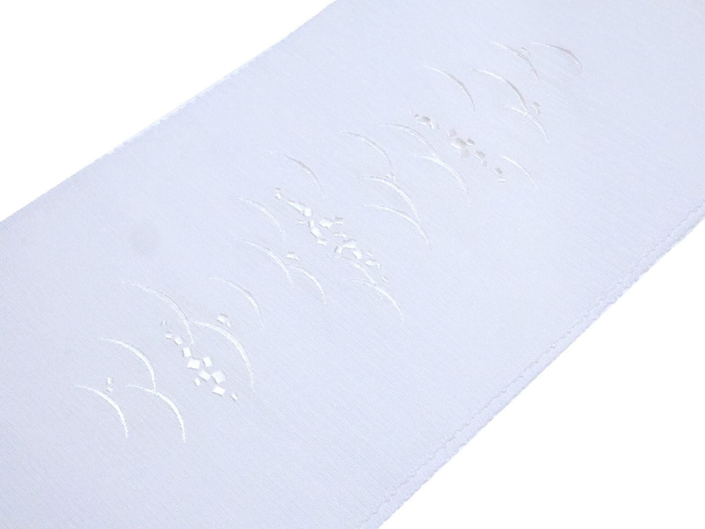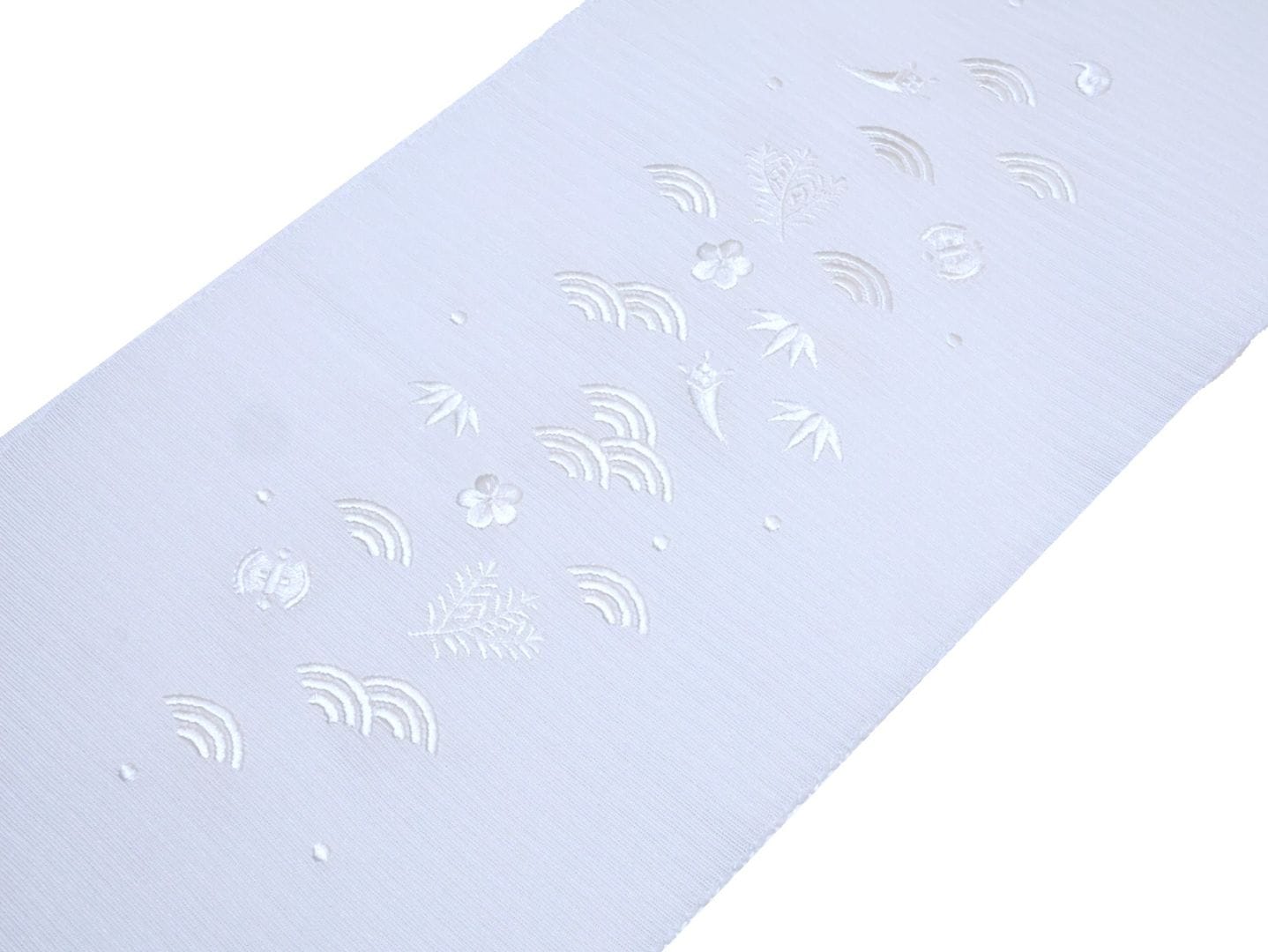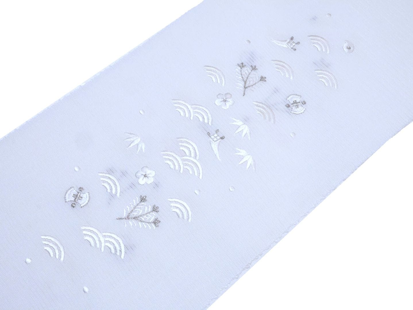 ・夏物正絹刺繍半衿「白色の地に白色と銀色の青海と宝尽くしの刺繍」