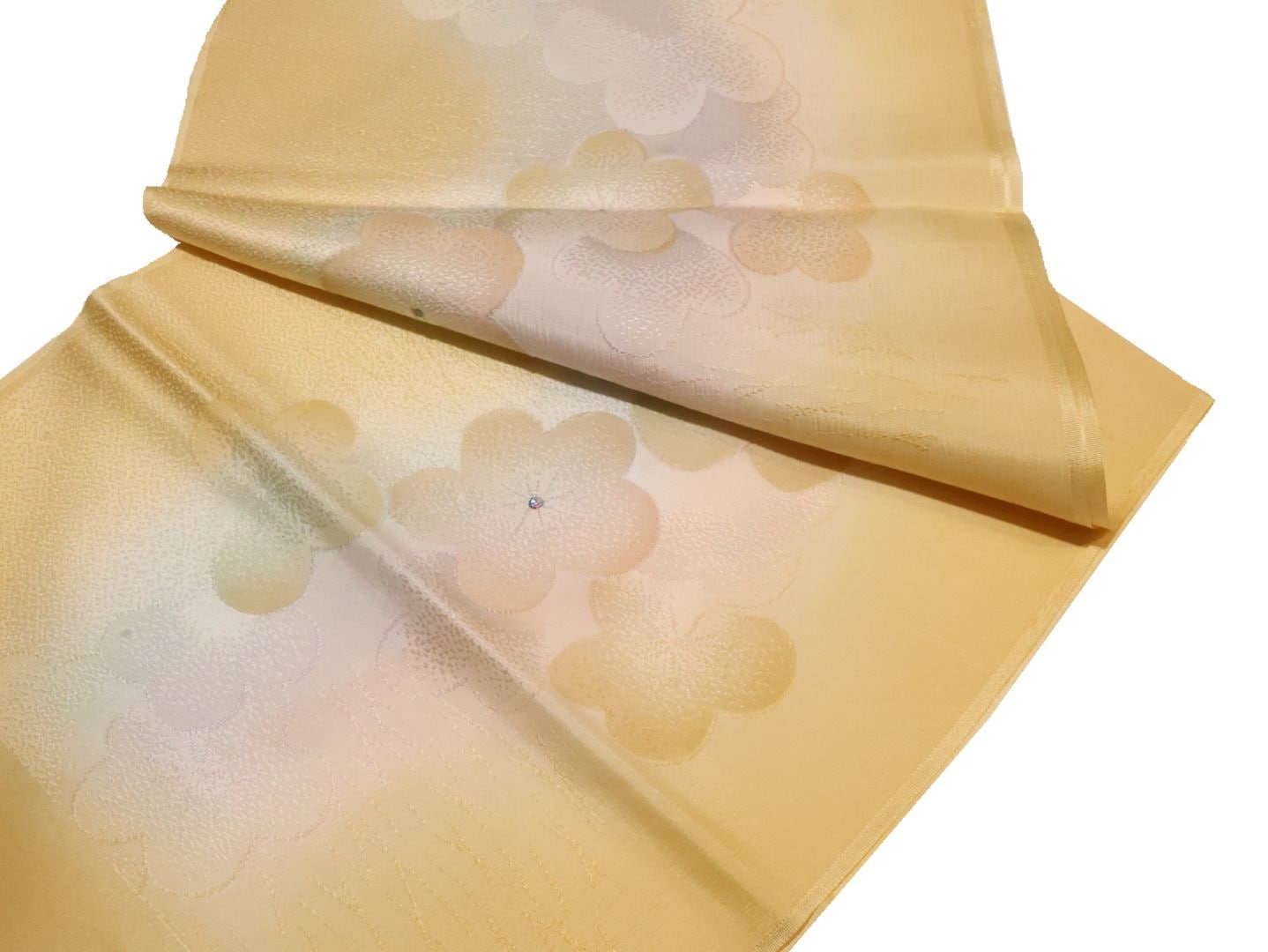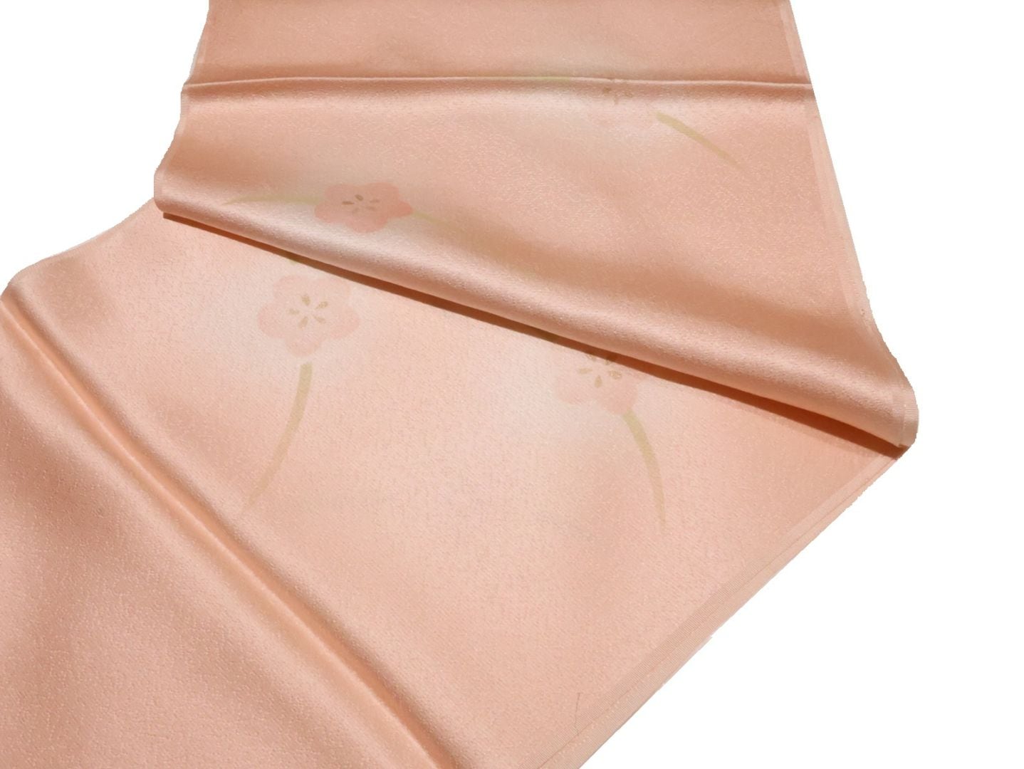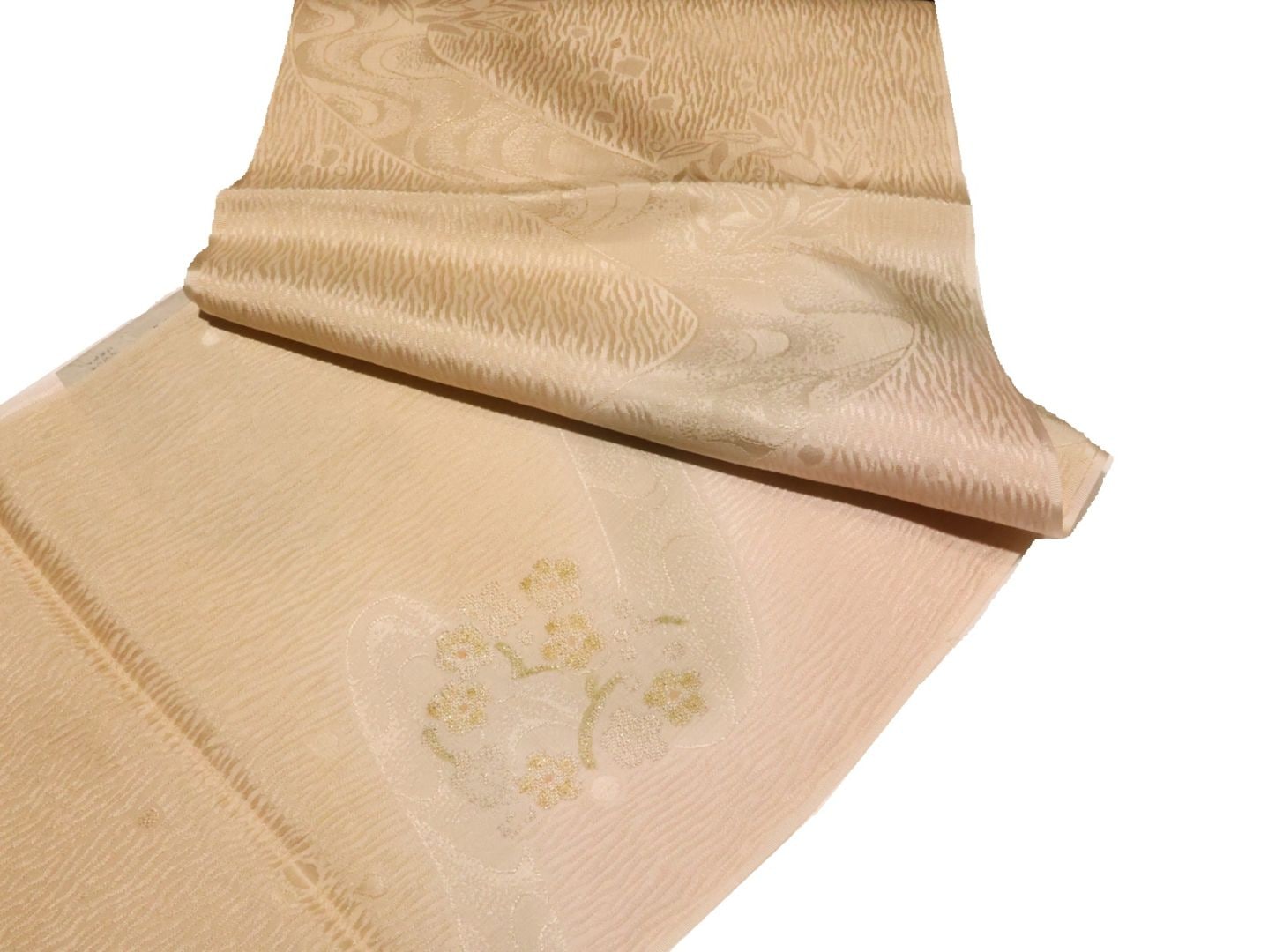 ・正絹帯揚げ「ベージュ色と淡いピンク色のぼかしの地に流水と花の模様」