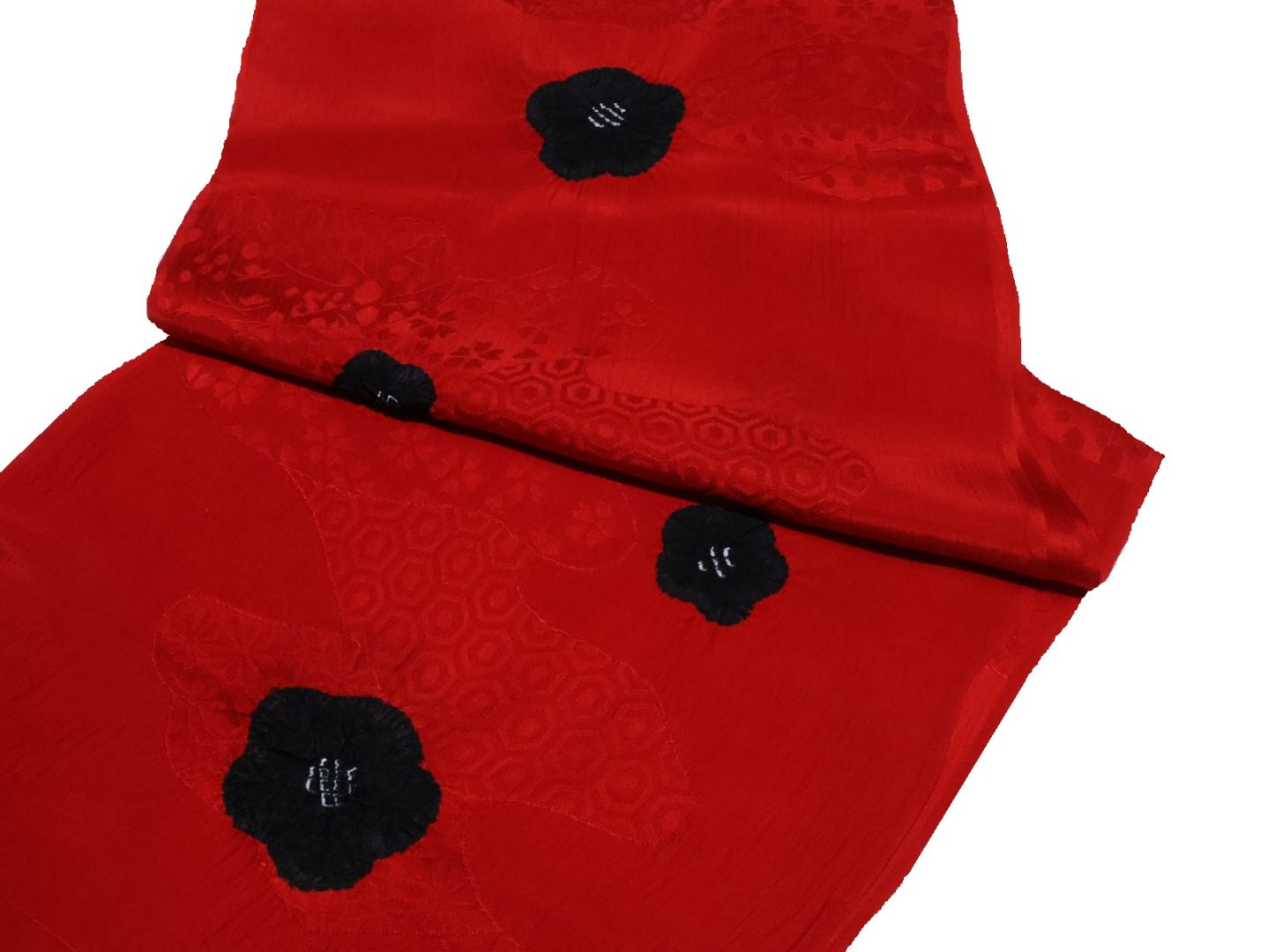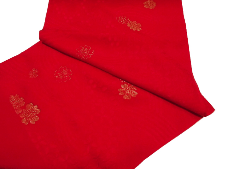・正絹帯揚げ「赤色の地に青海波、七宝、亀甲の地模様と金色の桜」
