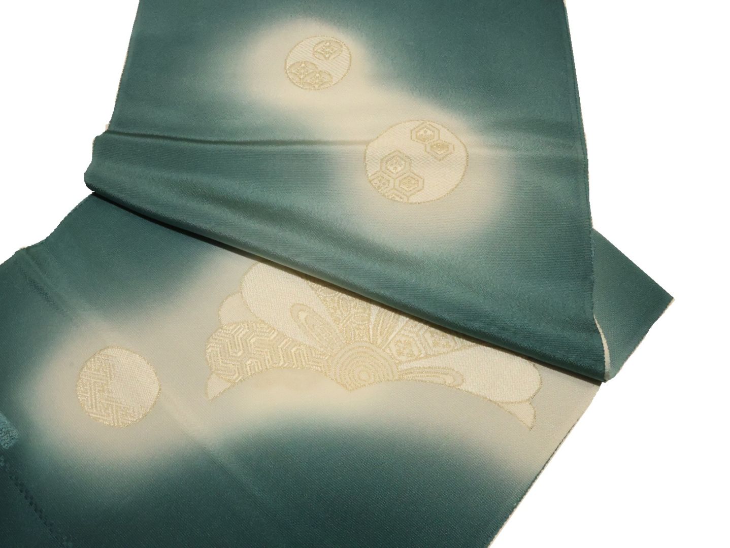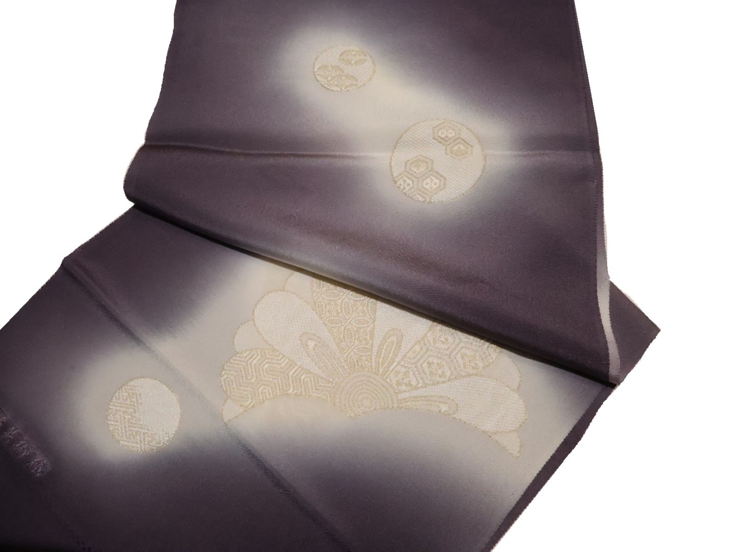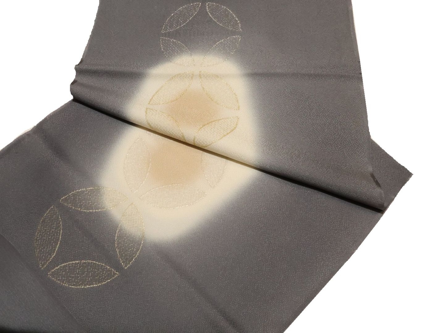 ・正絹帯揚げ「濃いグレー色の地に金糸の七宝模様と薄クリーム色ぼかし」
