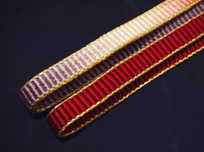 ・長尺正絹帯締め「エンジ色から薄紫色へのぼかし(金色の縁取り)」