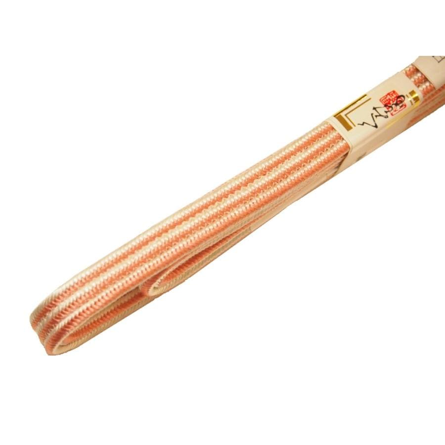 ・正絹帯締め「サーモンピンク色の地に白色と黄色の模様と金ラメ」