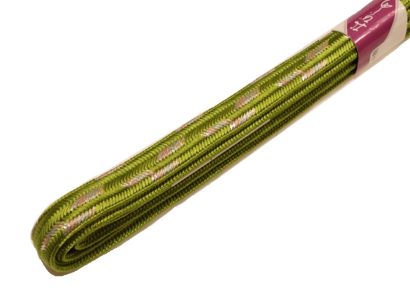 ・正絹帯締め(変わり平組)「緑色、赤紫色、青緑色、アイボリー色の模様」