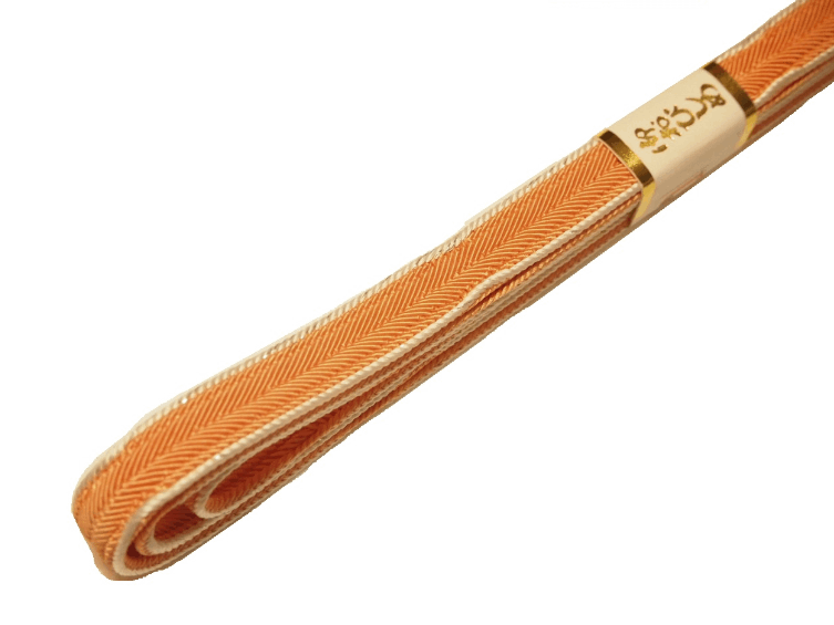 ・長尺正絹帯締め「サーモンピンク色の地に白色と銀色の縁取り」