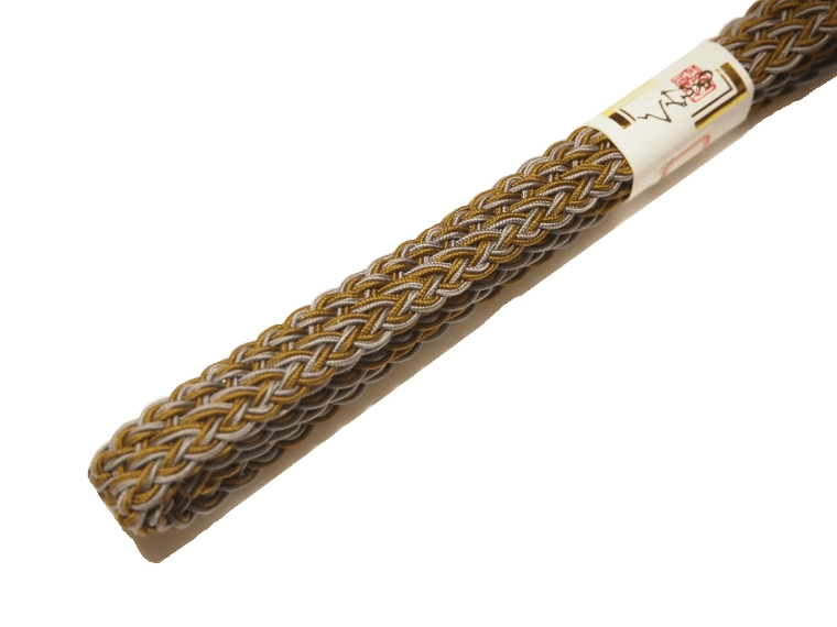 ・夏物正絹帯締め(平組)「灰白色の地に紺色、水色、金色の縁取り」