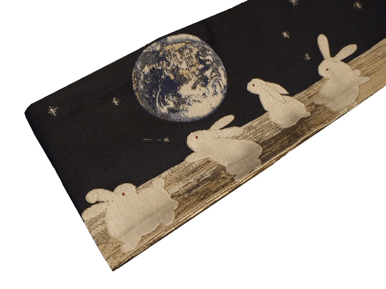 ポリエステル半幅帯「黒色の地にブルーグレー色のイルカと惑星の柄」