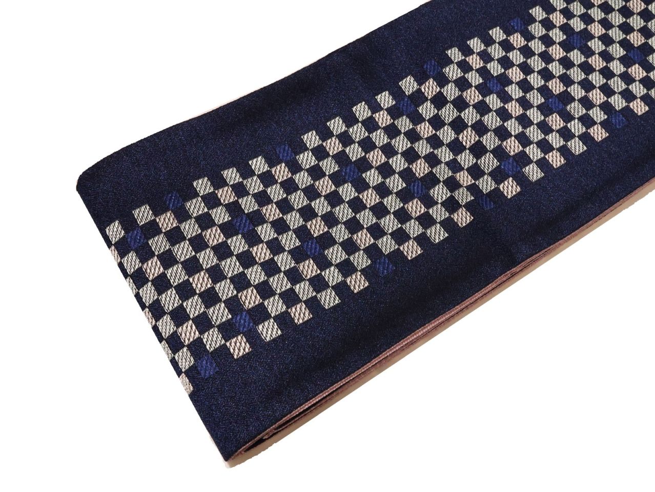絹交織博多織半幅帯「青紺色の地にグレー色の麻の葉模様と深緑色ライン」