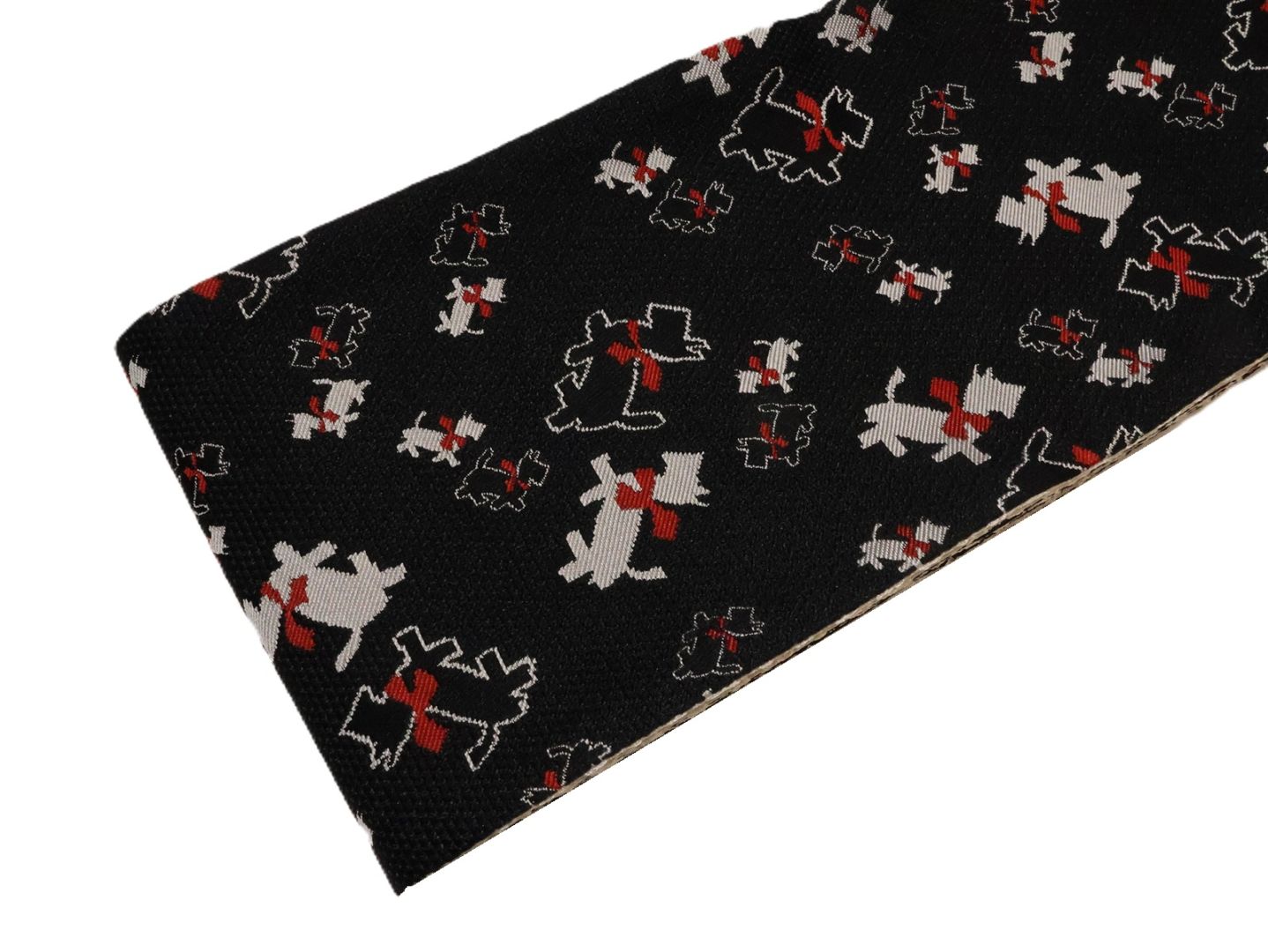 ポリエステル半幅帯「赤色のモール地にアイボリー色の雪の結晶の柄」