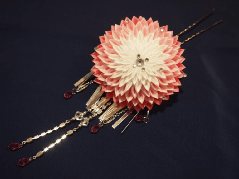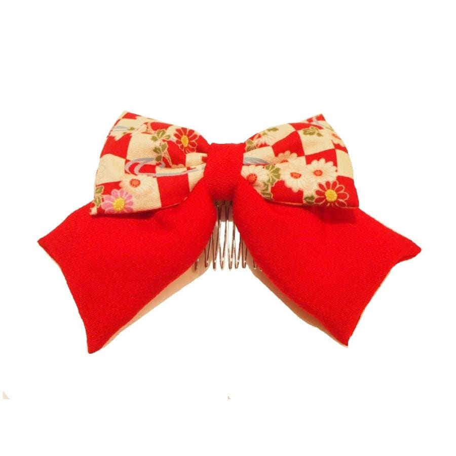 リボン髪飾り「(上)朱色の地に金の飾り紐(下)砂色の地に梅の柄」