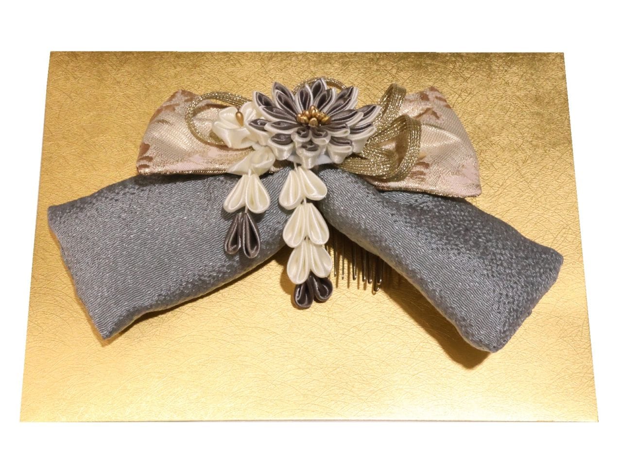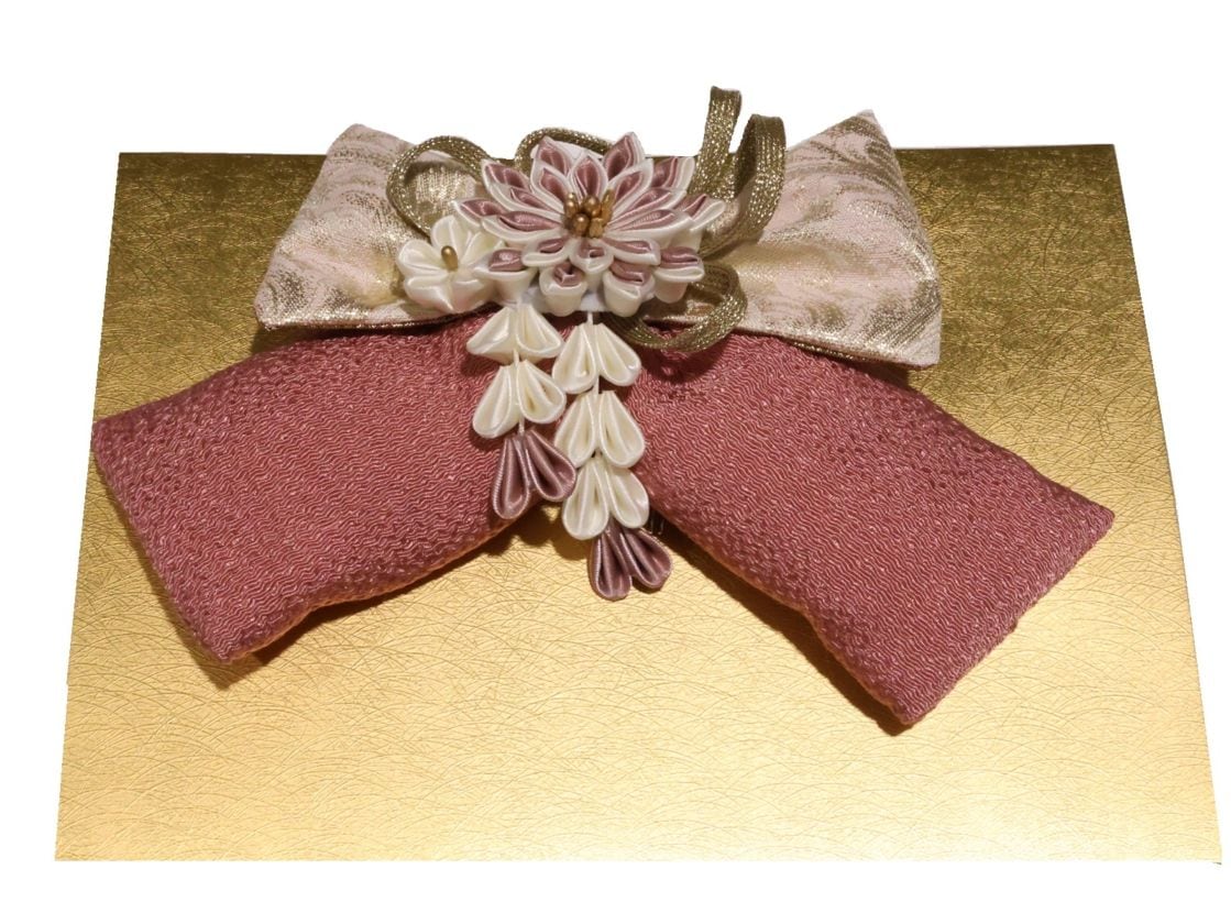 リボン髪飾り「(上)黄色の地に金の飾り紐(下)砂色の地に梅の柄」