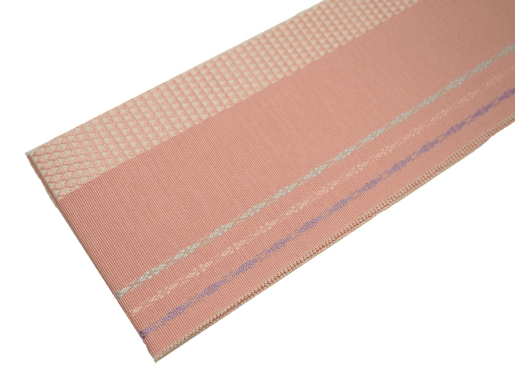 ・長尺正絹博多織伊達締め「ピンク色の地に3色の独鈷模様と鱗模様」
