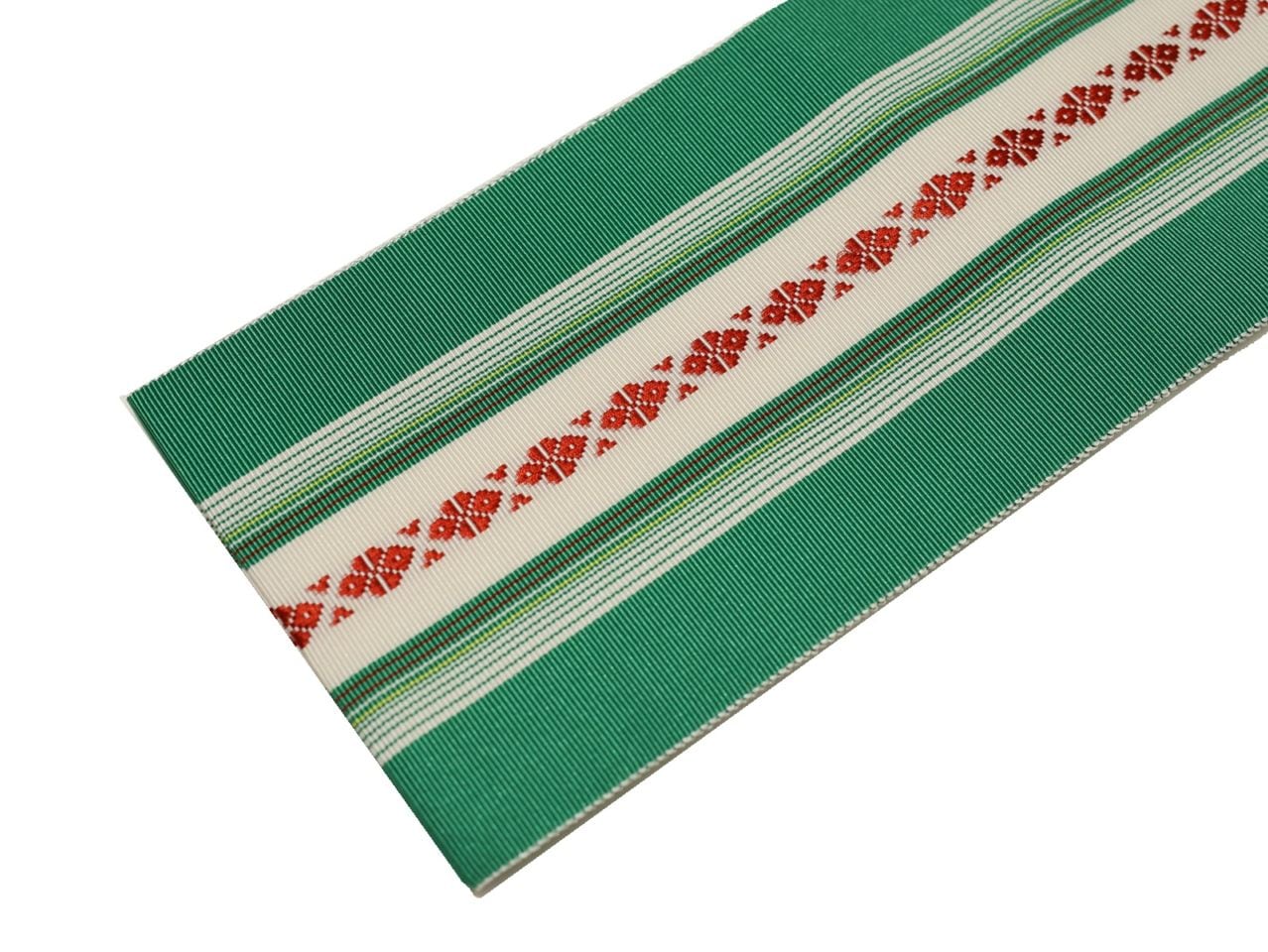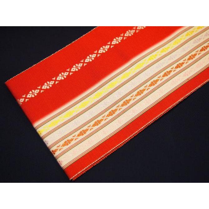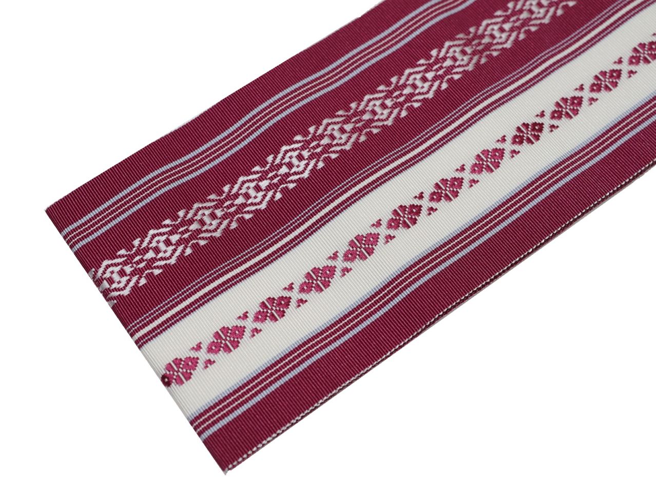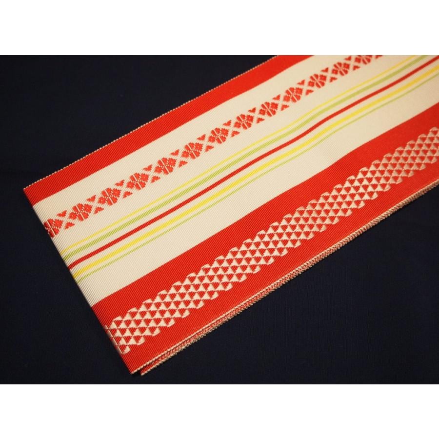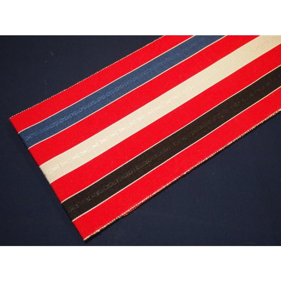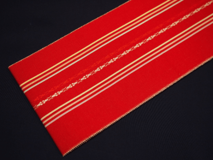 ・長尺正絹博多織伊達締め「赤色の地に紺色、グレー、黒色の縞模様」