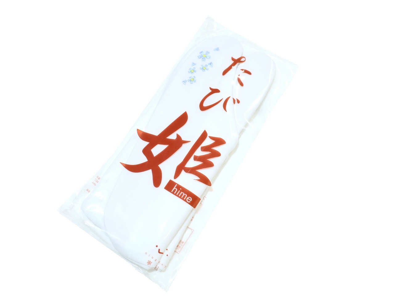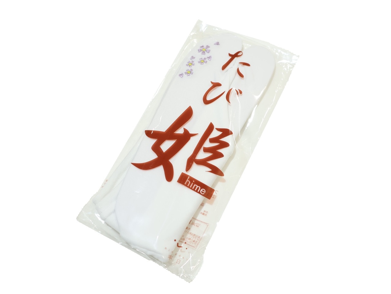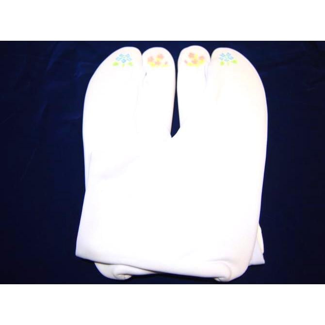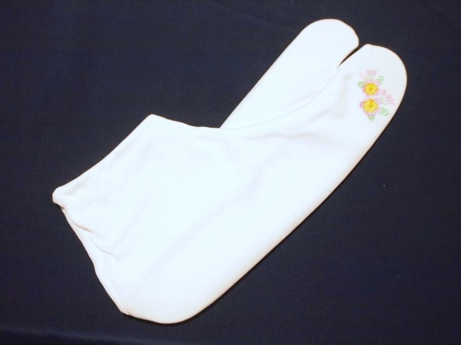 「コハゼなし」ストレッチ足袋「白色の地に薄紫色と黄色の花の刺繍」