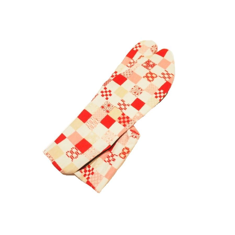 「コハゼなし」柄物ストレッチ足袋「アイボリー色、赤色、ピンク色の市松模様」