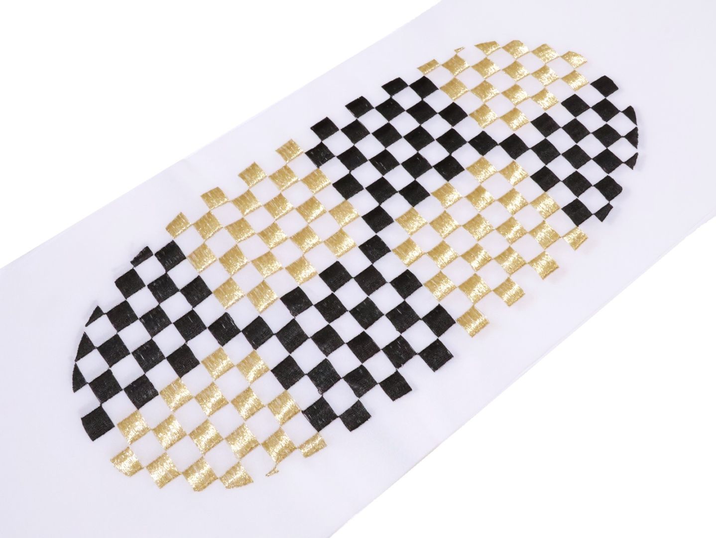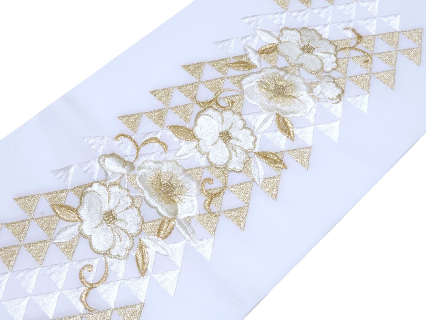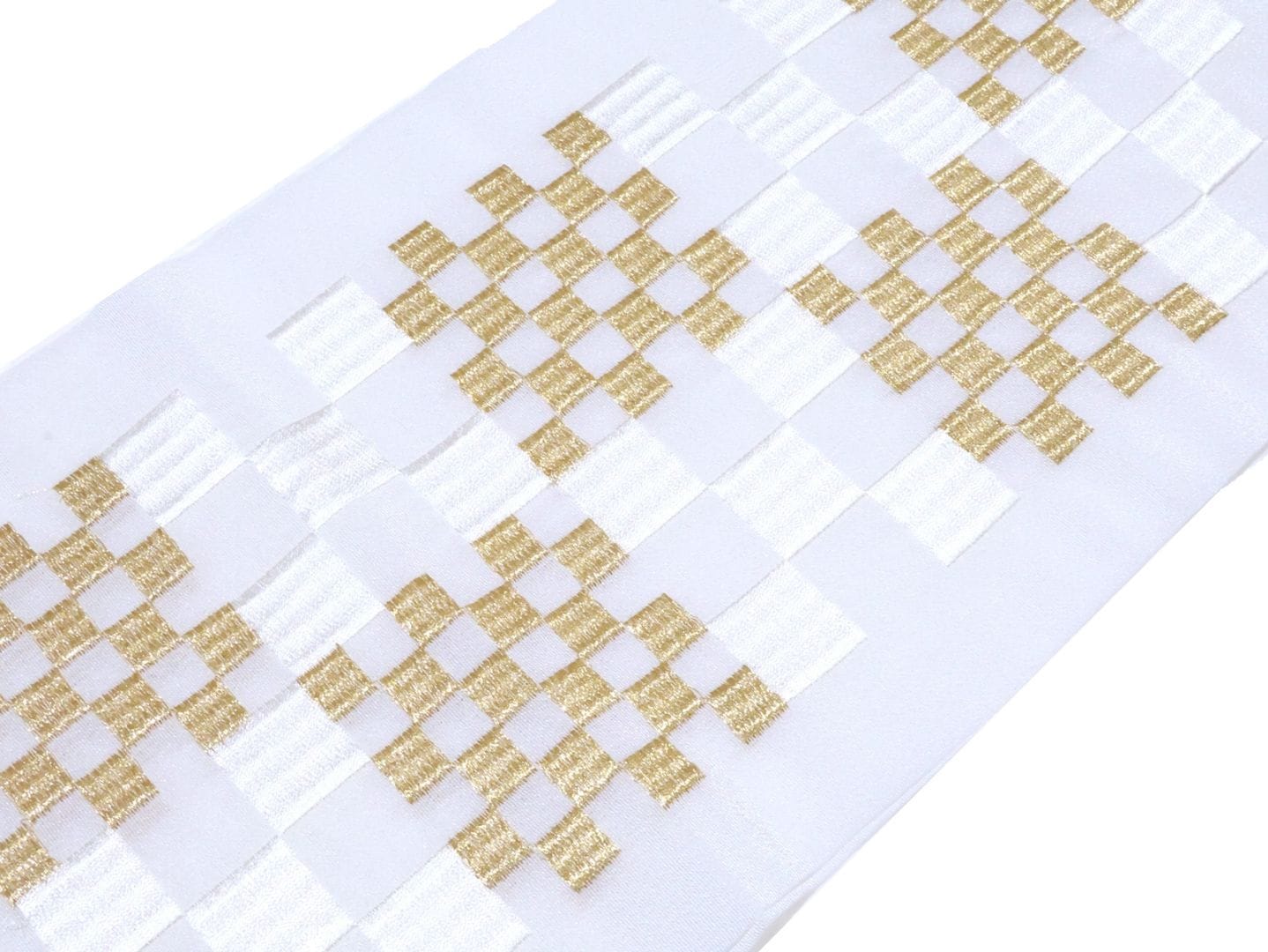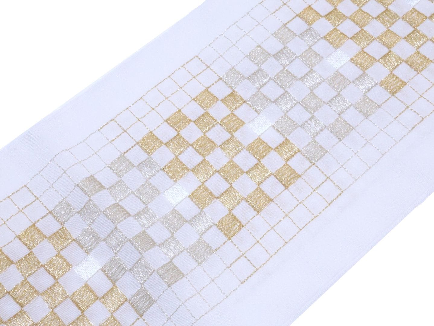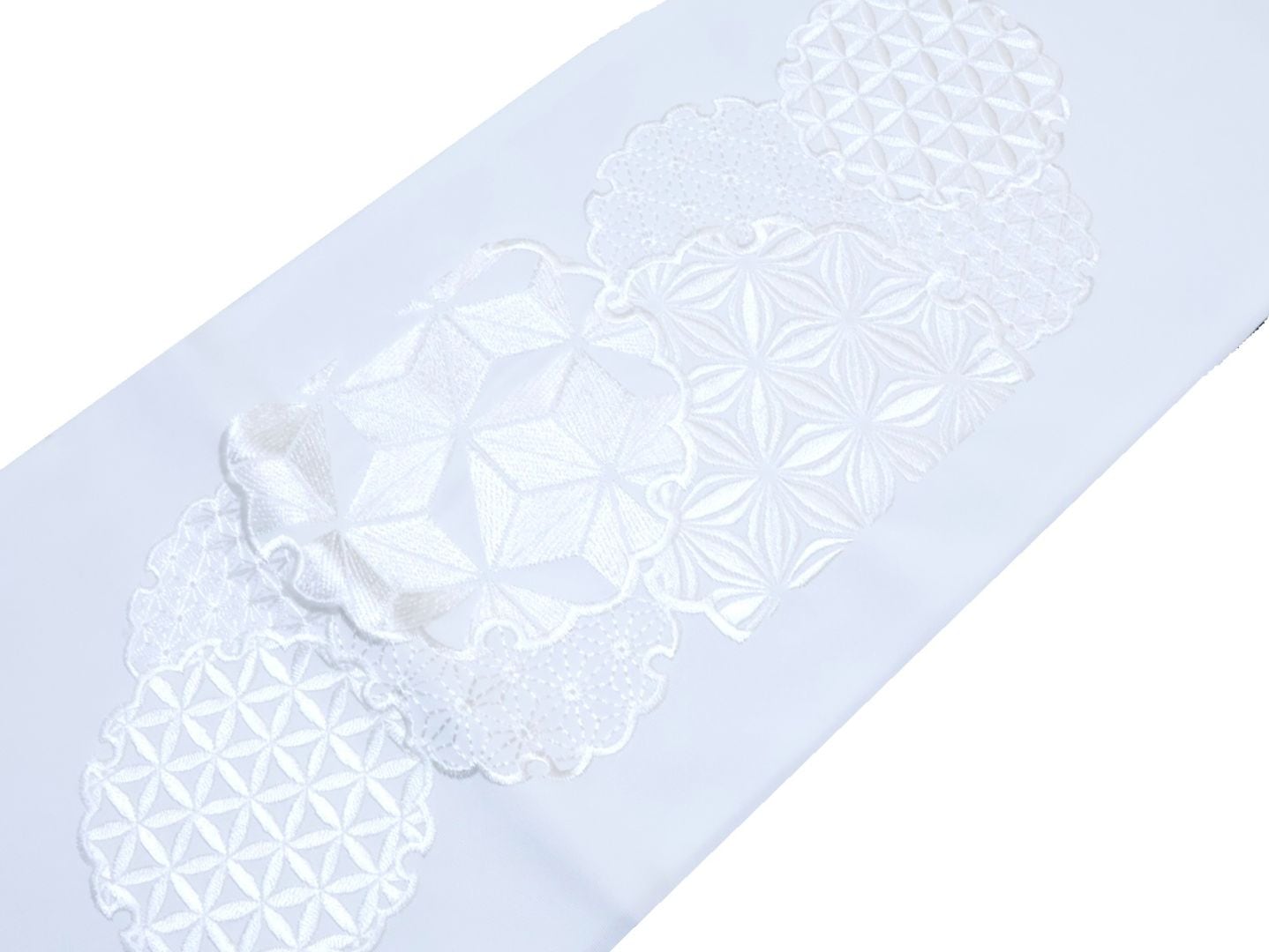 刺繍半衿「白色の地に薄紫色と薄クリーム色の幾何学模様の刺繍」