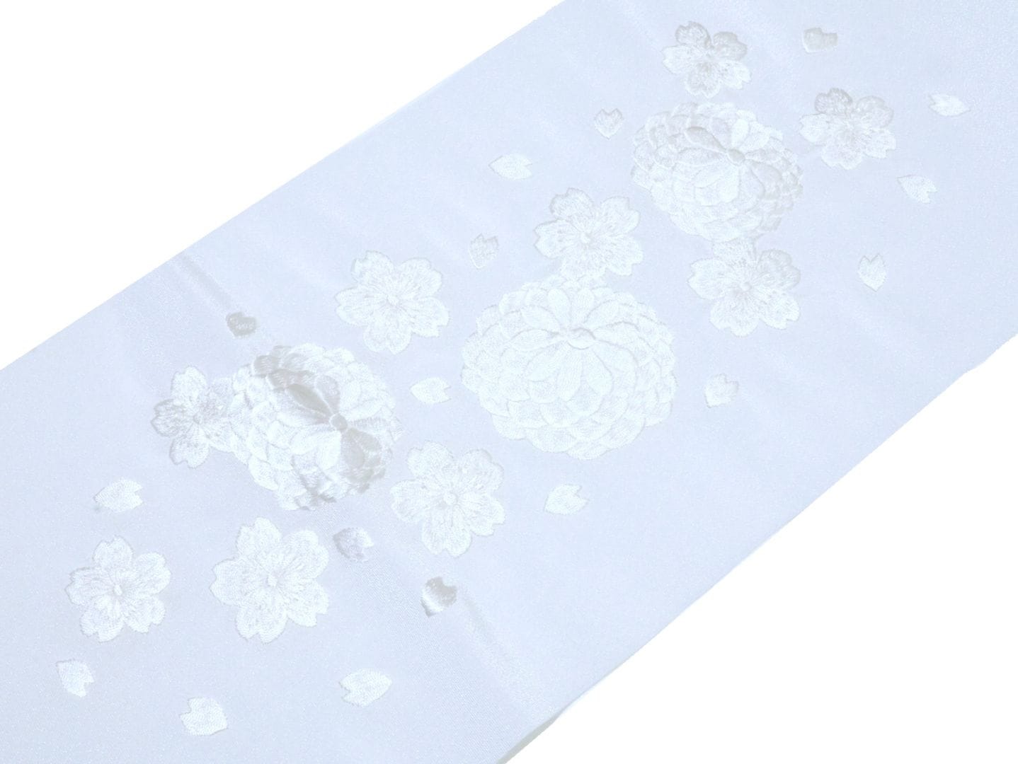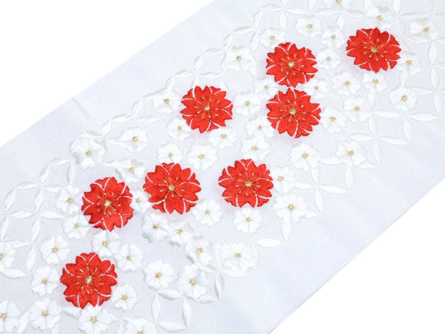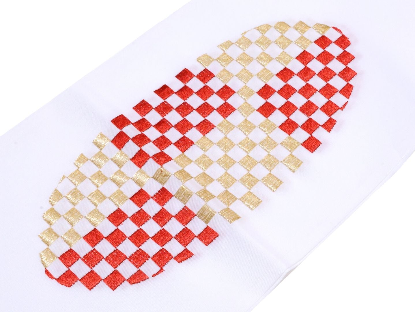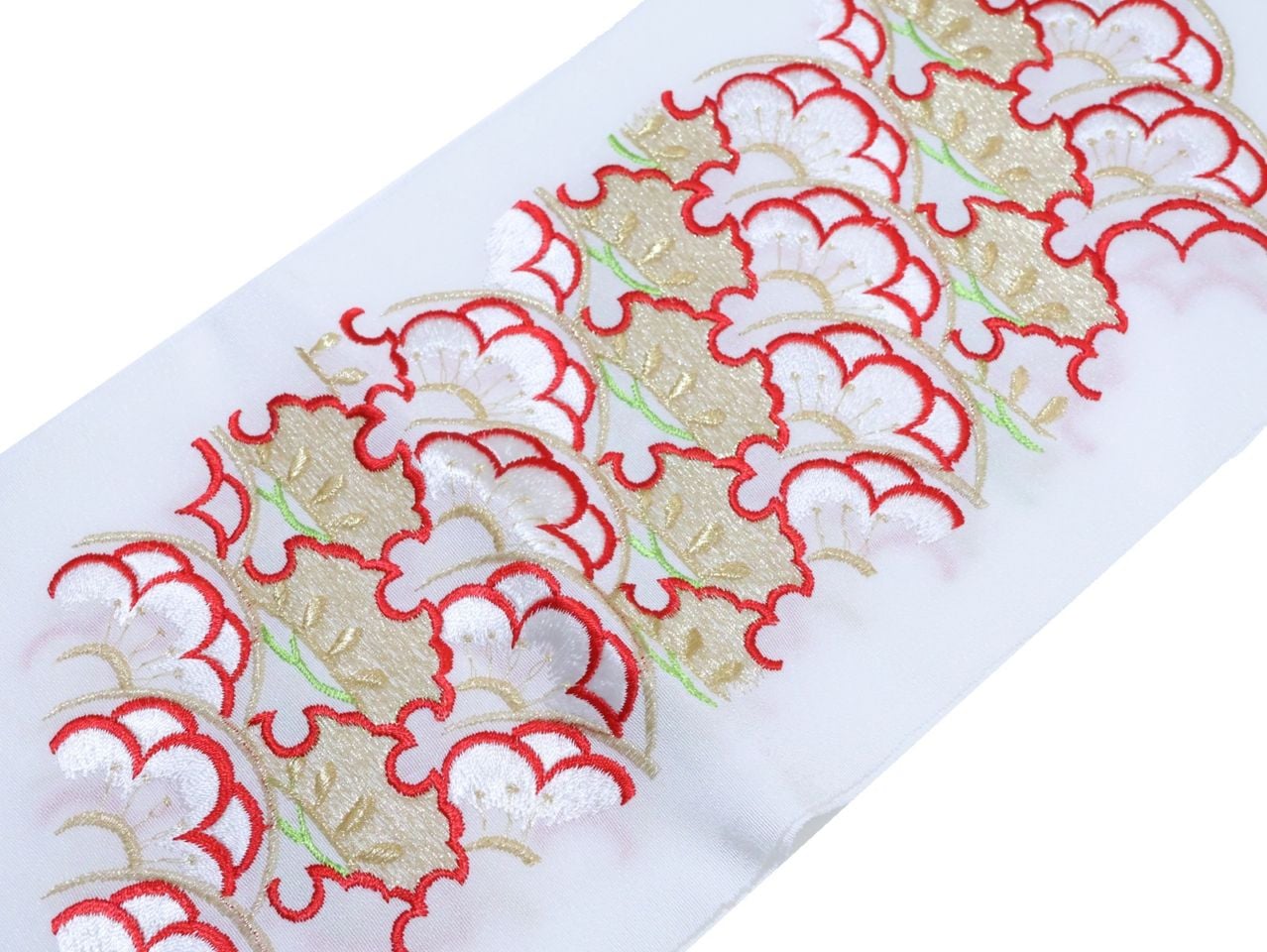・刺繍半衿「白色の地に白色、赤色、金色の雪輪青海と梅青海の刺繍」