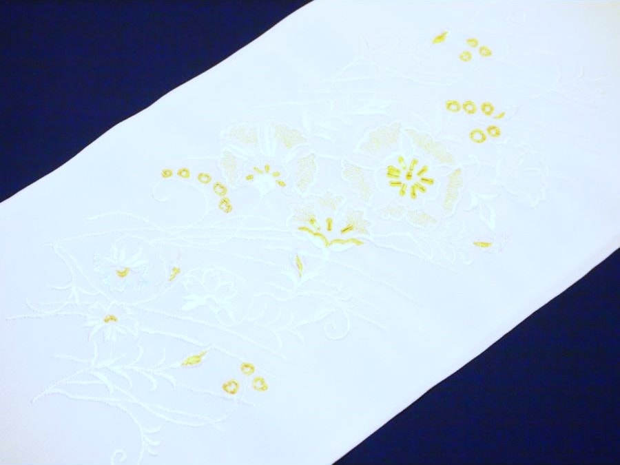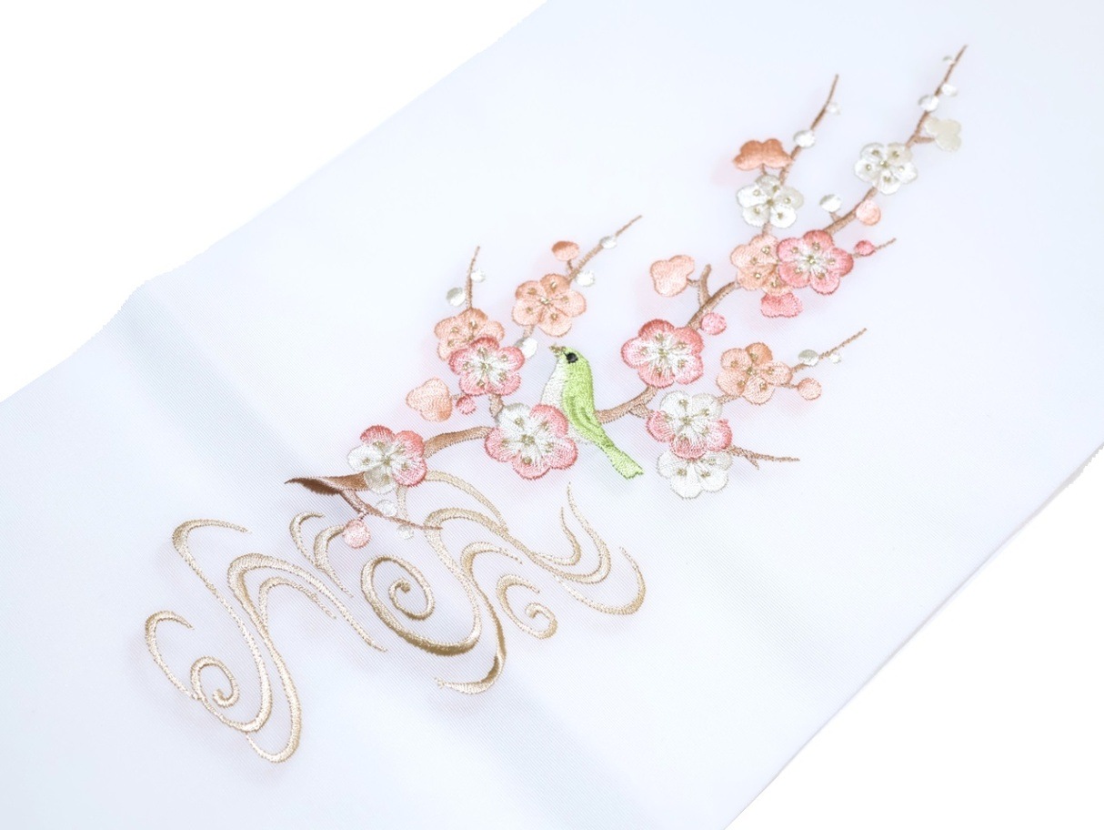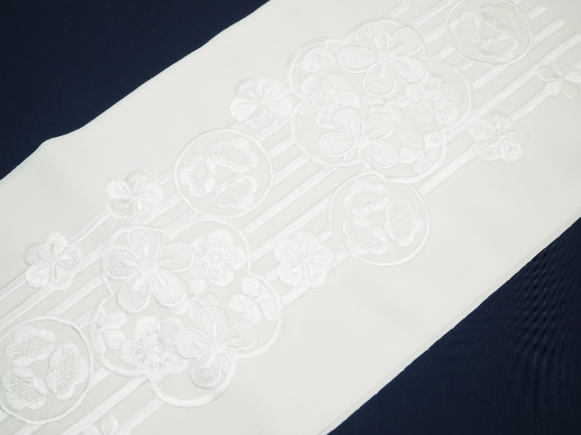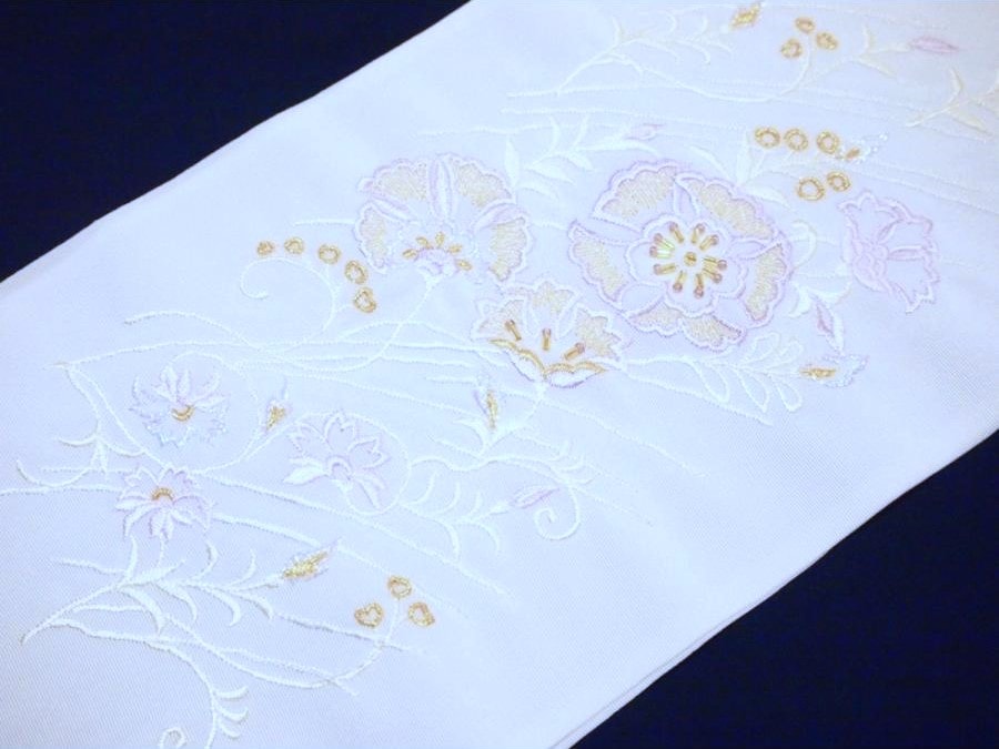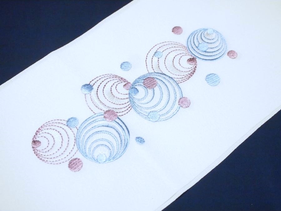 刺繍半衿「白色の地に薄紫色と薄クリーム色の幾何学模様の刺繍」