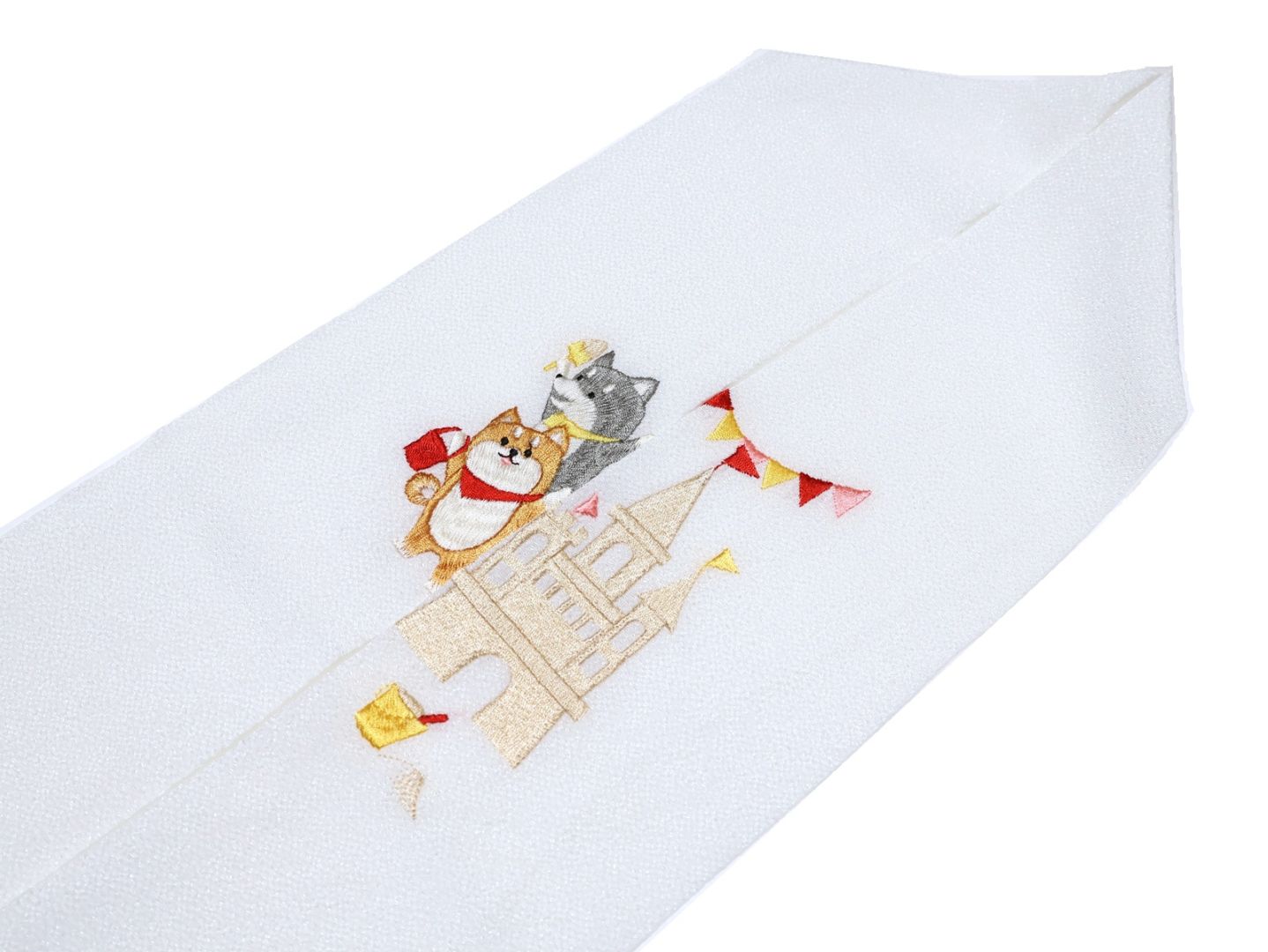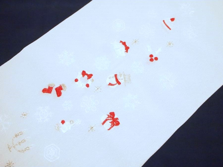 ・刺繍半衿「白色の地に赤色と白色の雪ダルマ、ケーキ、プレゼントの刺繍」