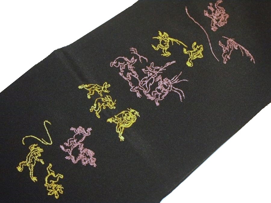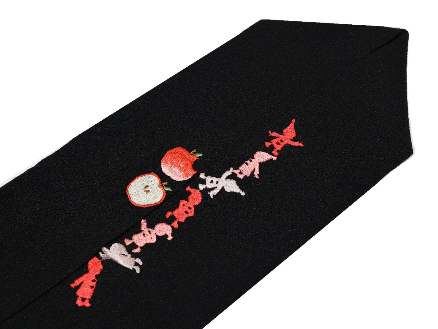 ・片身替わり刺繍半衿「黒色の地に赤色の7人の小人とリンゴの刺繍」