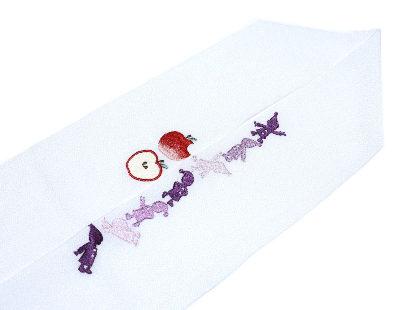 ・片身替わり刺繍半衿「白色の地に紫色の7人の小人とリンゴの刺繍」