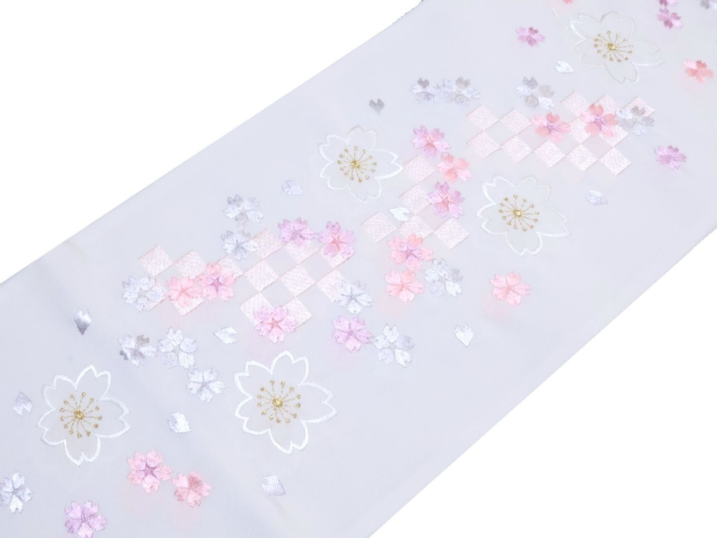 全通刺繍半衿「白地に白色、ピンク色、グレーの桜と市松模様の刺繍」