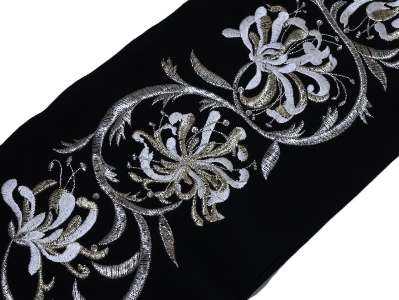 ・刺繍半衿「黒色の地に銀色とシルバーグレー色の乱菊と唐草の刺繍」