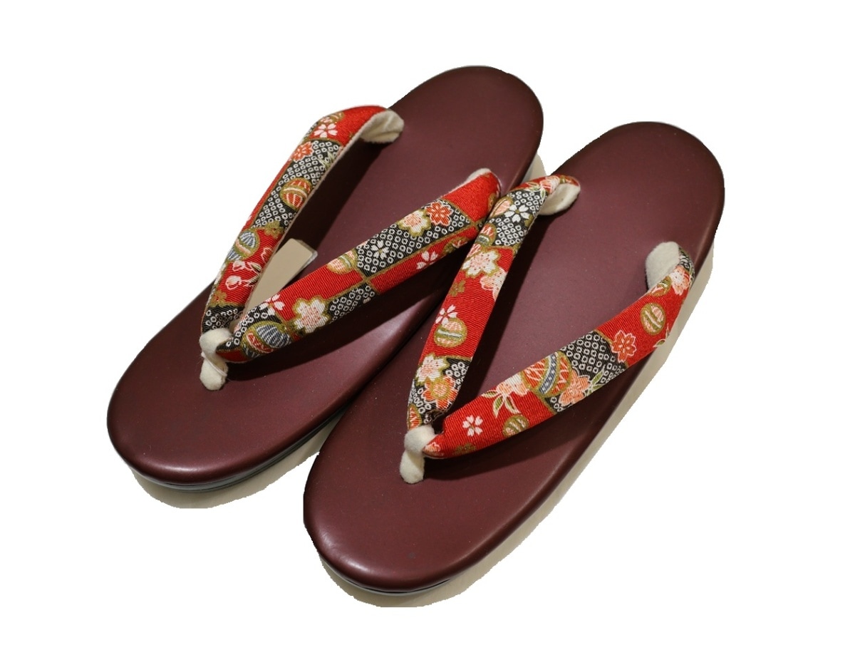 布鼻緒ウレタン草履「エンジ色の台に赤と黒(鹿の子模様)の鼻緒」