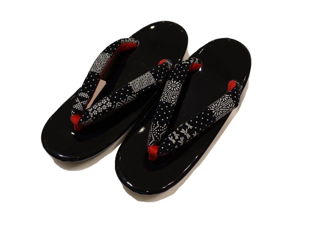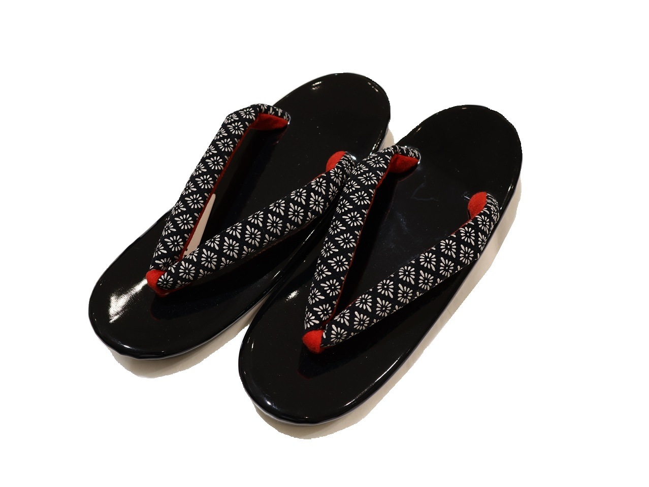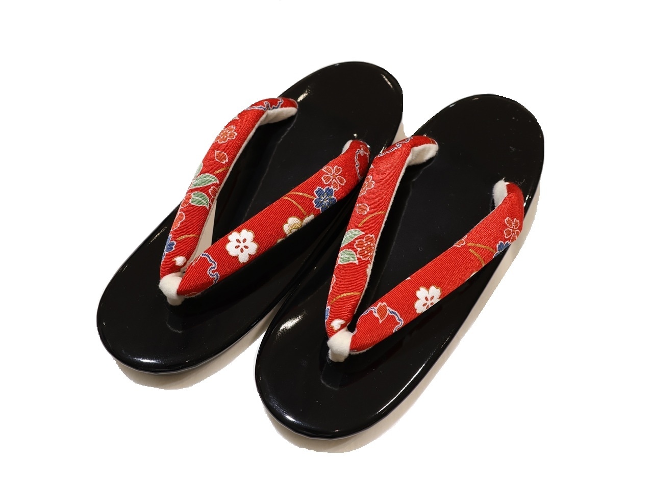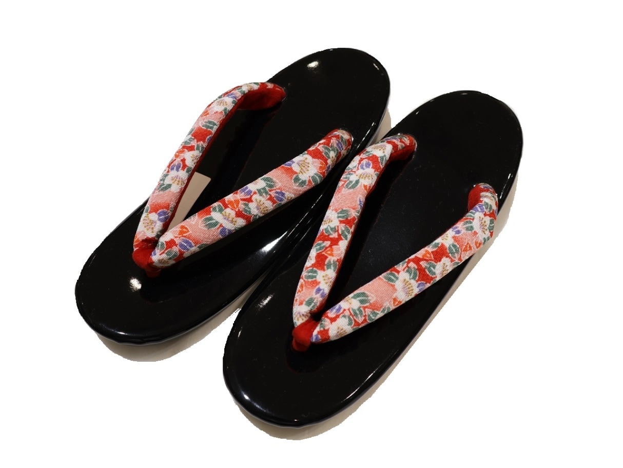 布鼻緒ウレタン草履「黒色の台に赤色とピンクぼかしに花柄の布鼻緒」