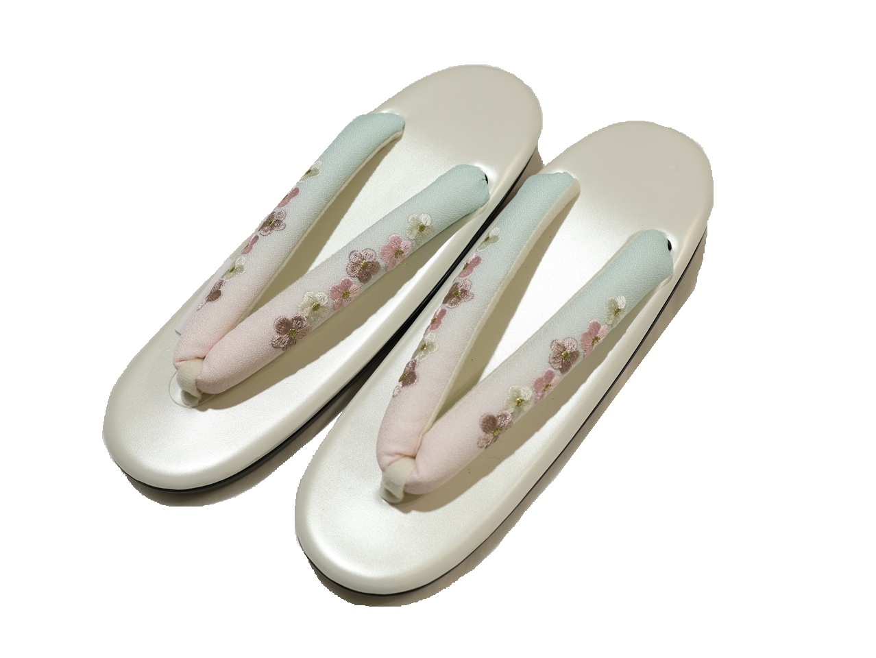刺繍鼻緒ウレタン草履「白パール色の台に薄水色ぼかしの刺繍鼻緒」