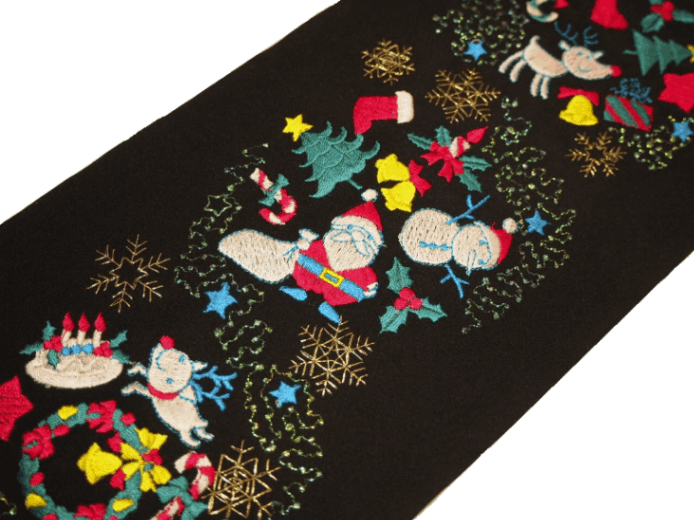 刺繍半衿「黒色の地にサンタとトナカイ、雪だるまの刺繍」