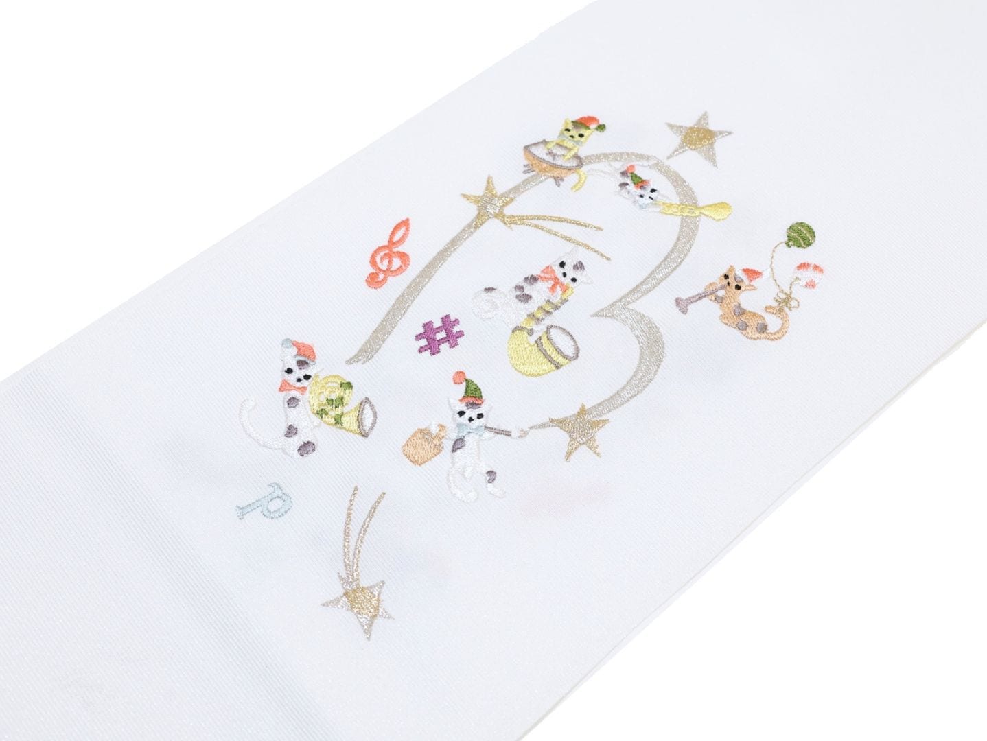 ・刺繍半衿「白色の地にネコと楽器の刺繍」