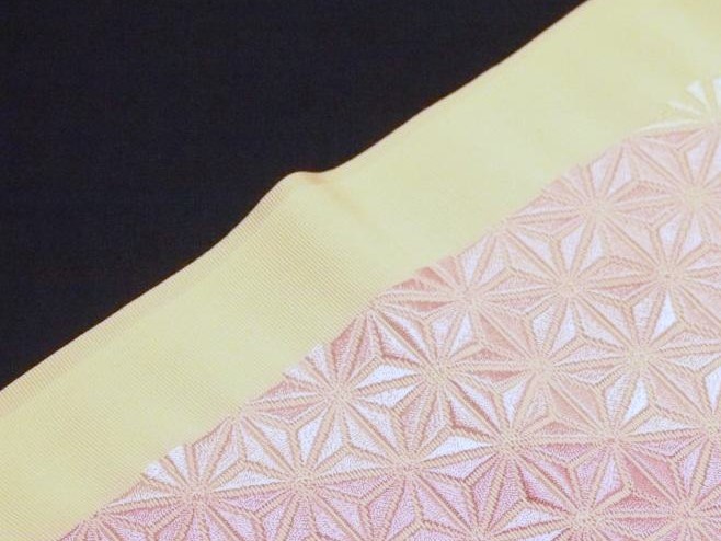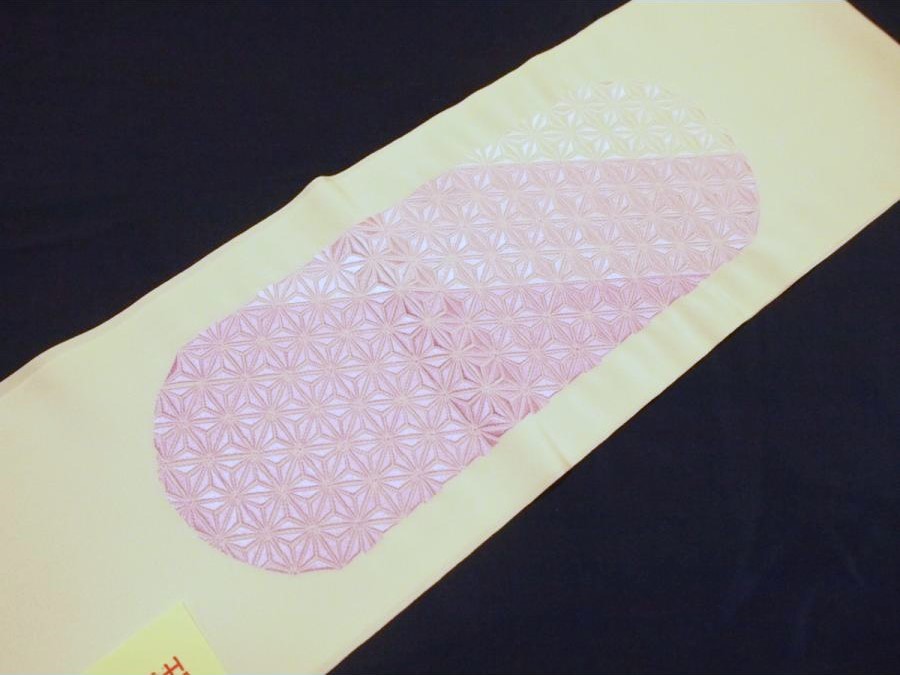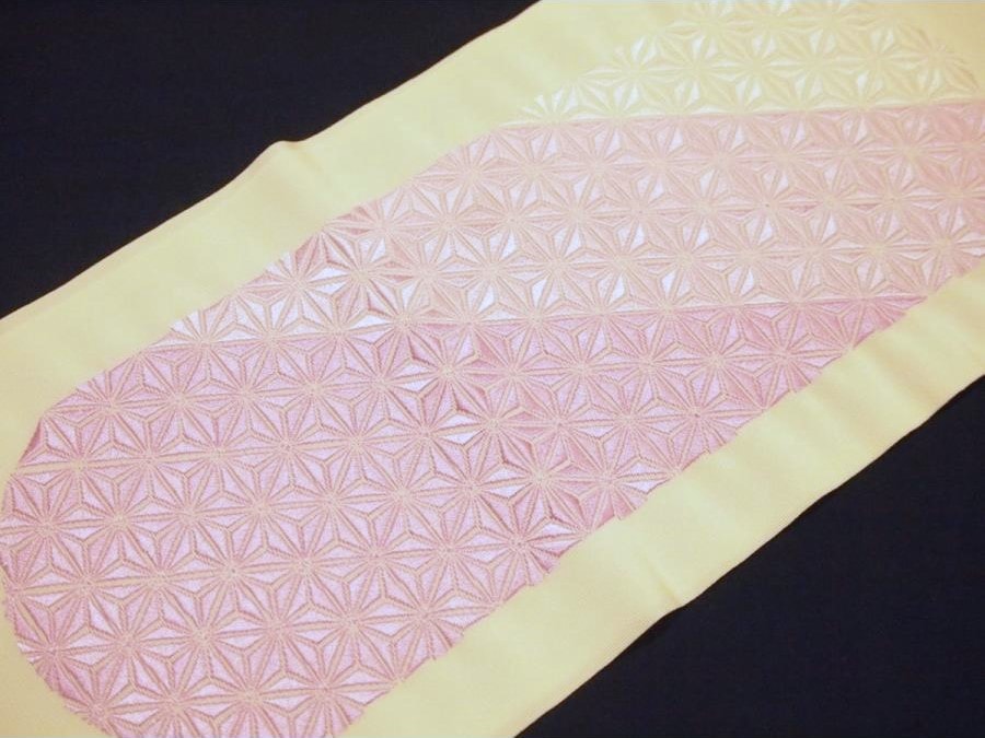 刺繍半衿「生成り色の地に紫色のグラデーションの麻の葉模様」