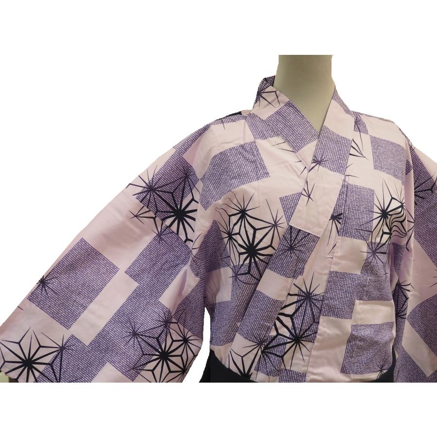 ねまき浴衣「濃淡のフジ色の市松と麻の葉模様(№2495)」