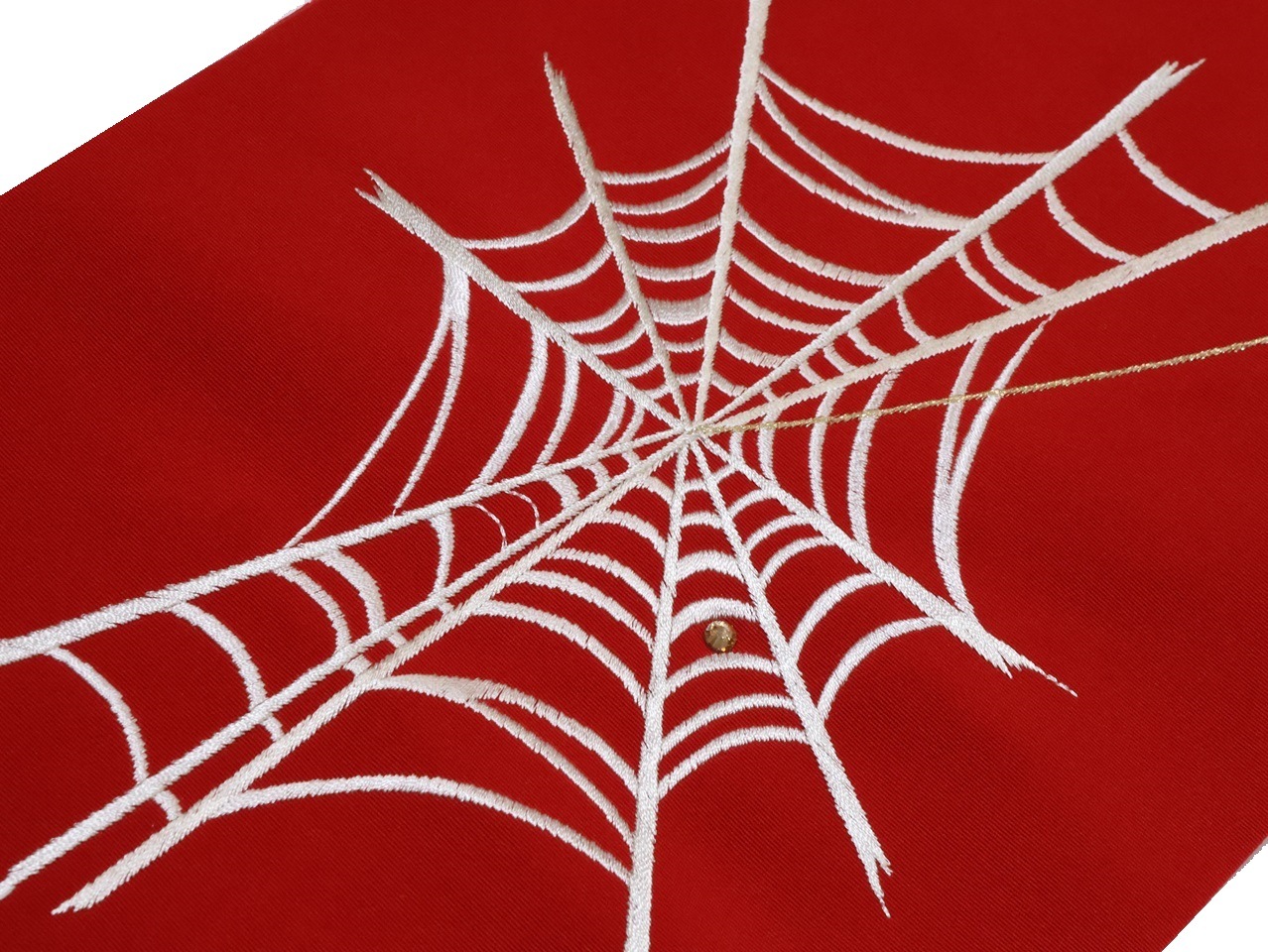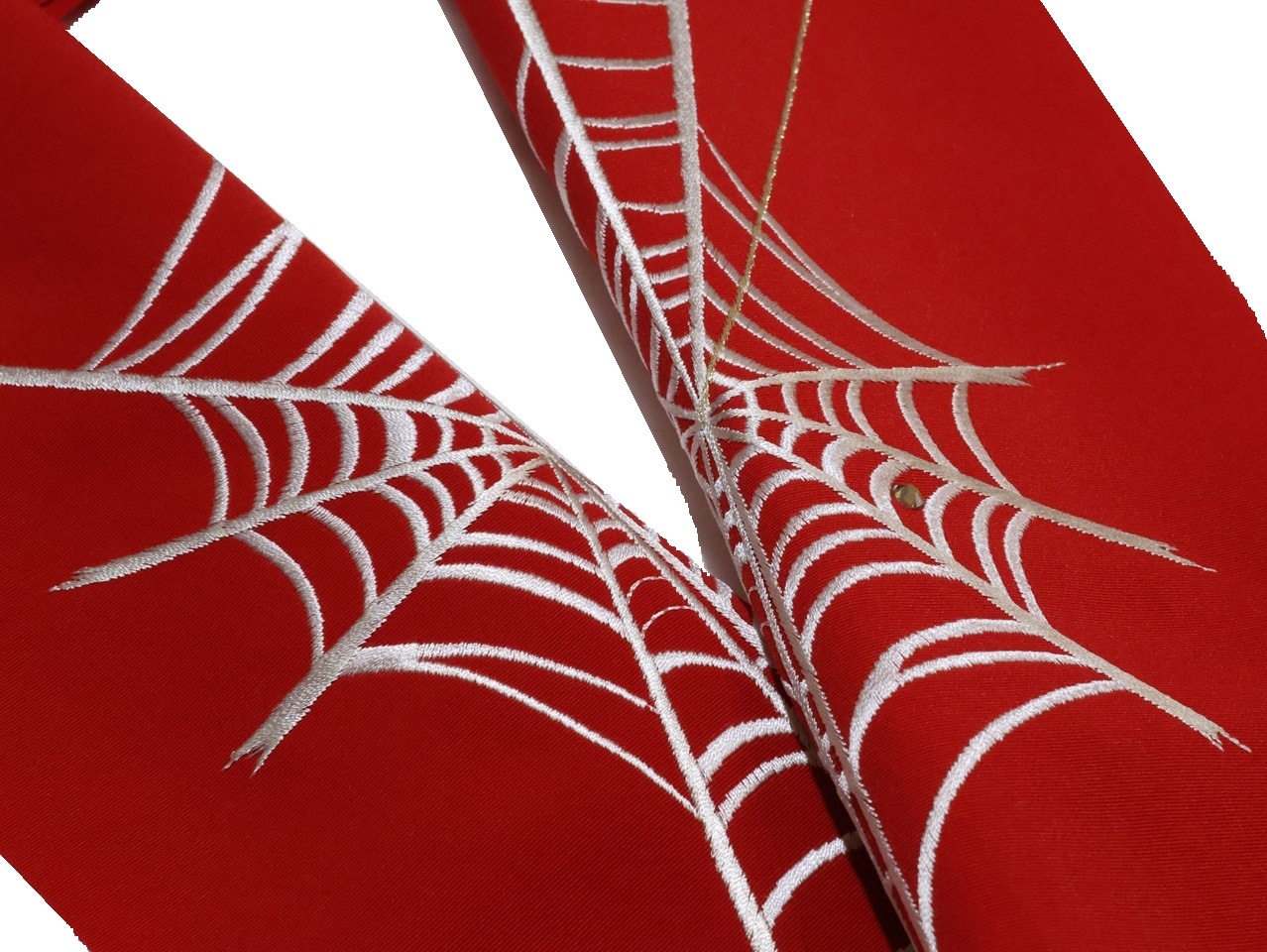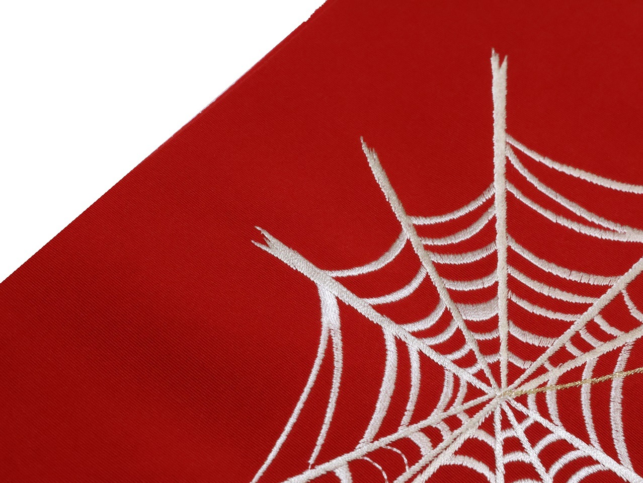 赤色の地に銀色の蜘蛛の巣の模様の刺繍が入ります。