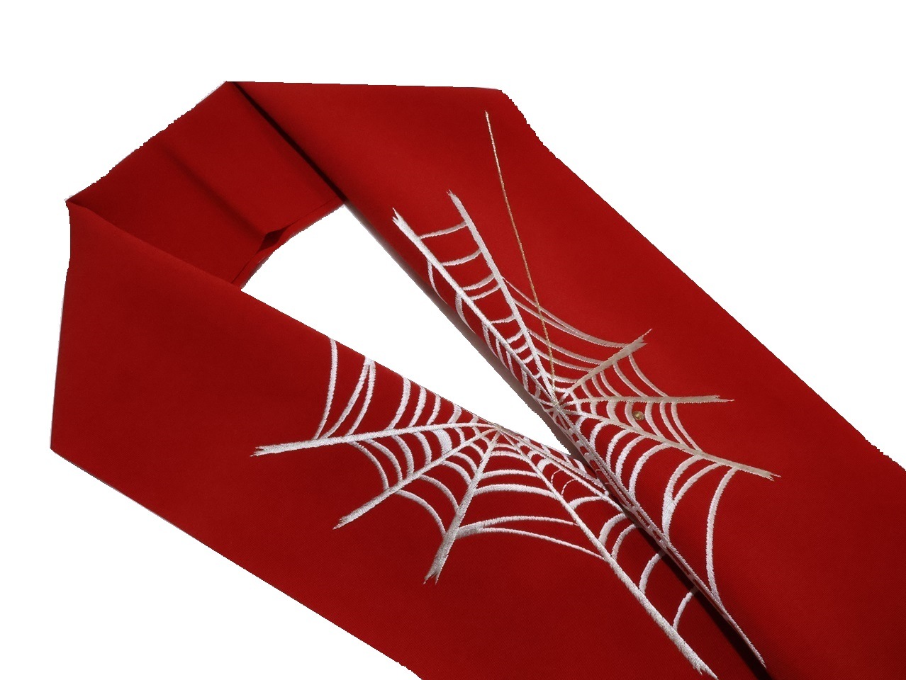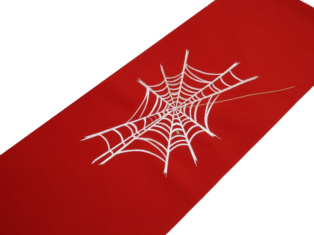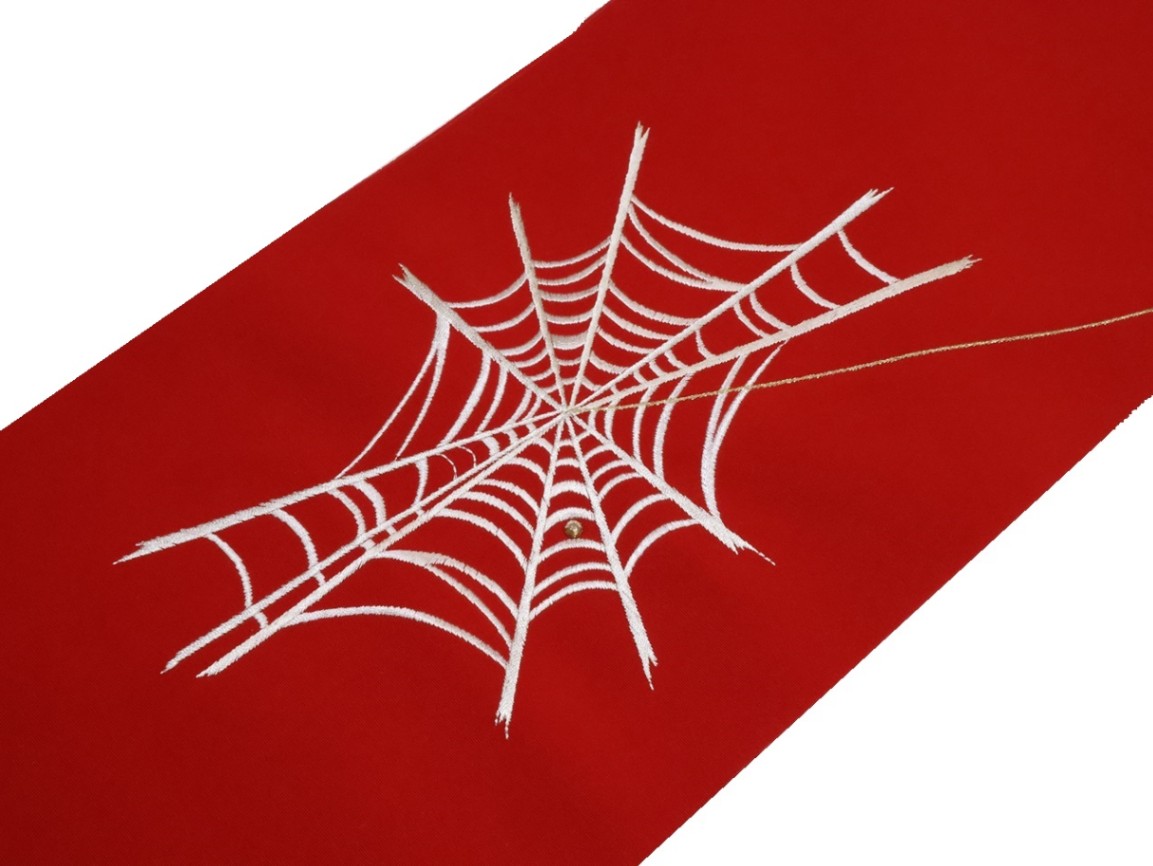 赤色の地に銀色の蜘蛛の巣の模様の刺繍が入ります。