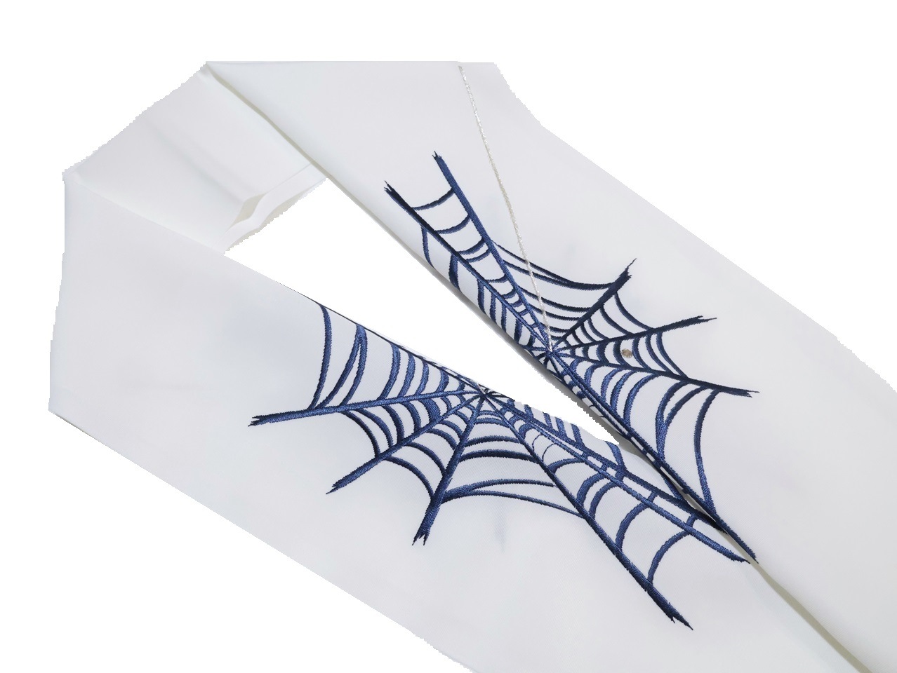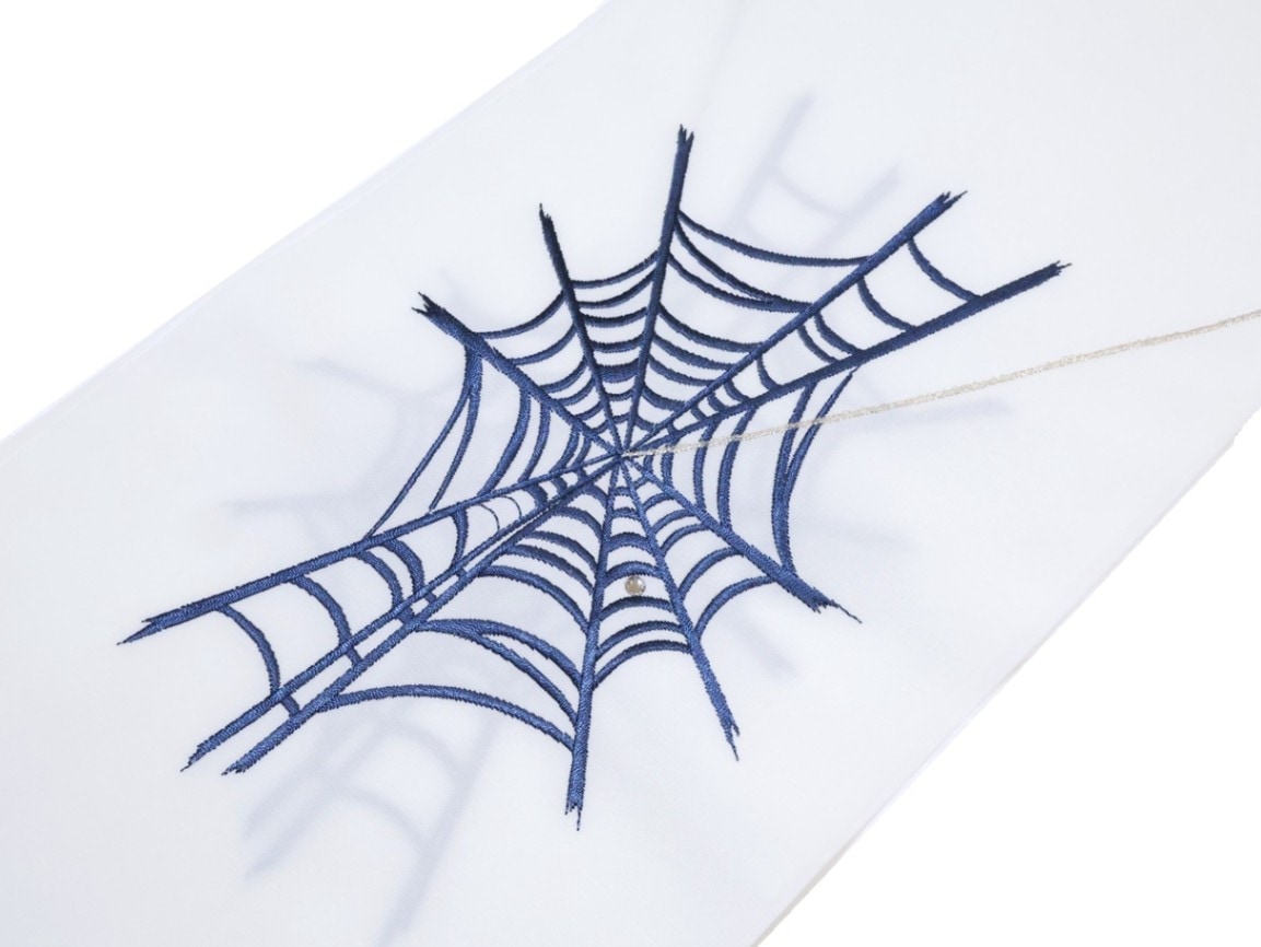 白色の地に紺色の蜘蛛の巣の模様の刺繍が入ります。