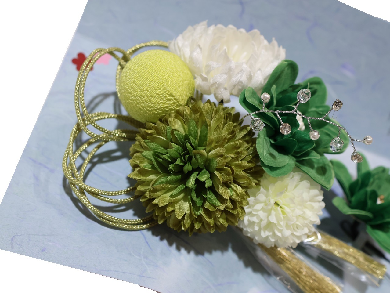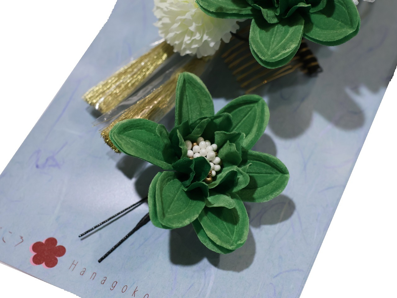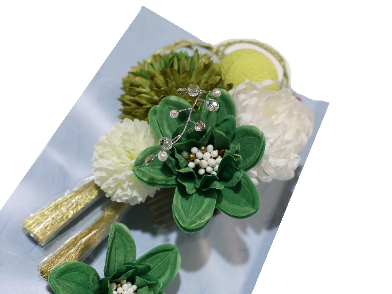 大きい髪飾りは緑色と抹茶色、白色の花と金色の下がり飾りが付いています。