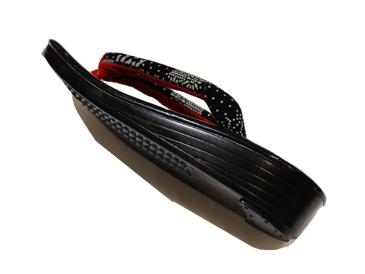 布鼻緒ウレタン草履「黒色の台に印伝調鼻緒(小紋柄市松の柄)」