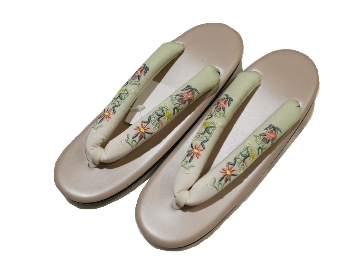 刺繍鼻緒ウレタン草履「ベージュ色の台に薄緑色ぼかしの刺繍鼻緒」