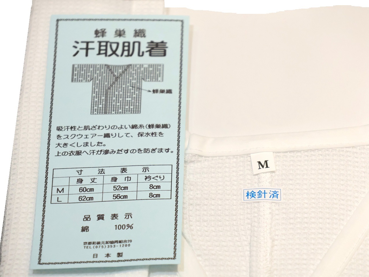 吸汗性と肌触りの良い綿糸を蜂巣織(スクエアー織)にして、吸湿性を大きくした汗取り肌襦袢です。