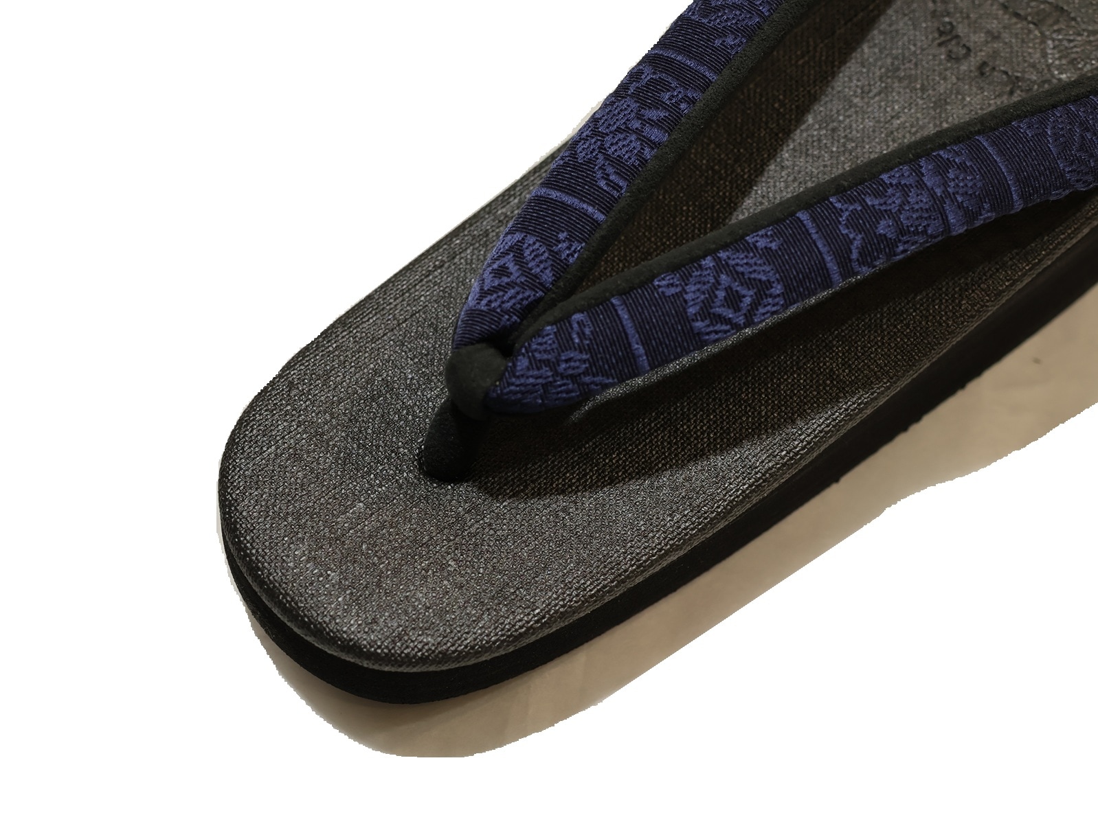 濃いグレー色の台(天)に紺色の博多織の布鼻緒になります。