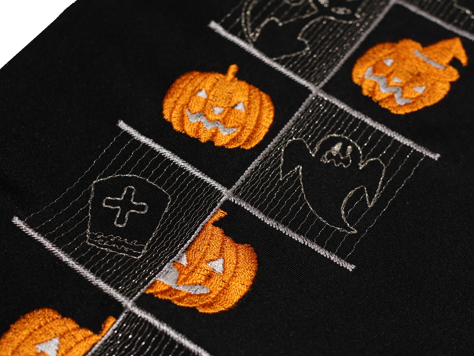 黒色の地に市松模様風にハロウィンの刺繍が入ります。