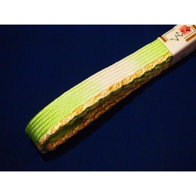 ・正絹帯締め(平組)「抹茶色の地にブドウ色と青緑色の縁取り」