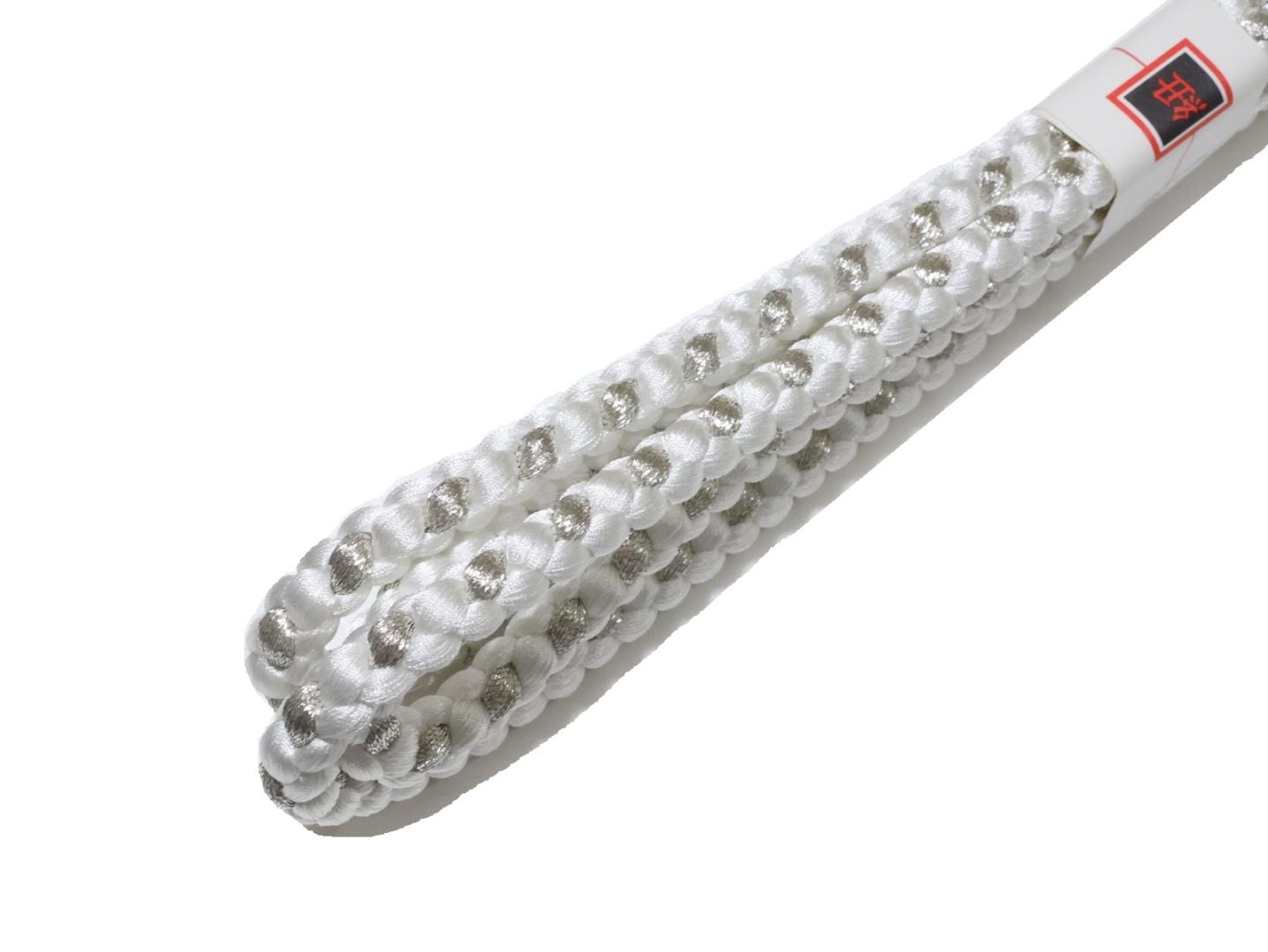 ・正絹帯締め(平組)「白地に深緑色の模様(深緑色の撚り房)」