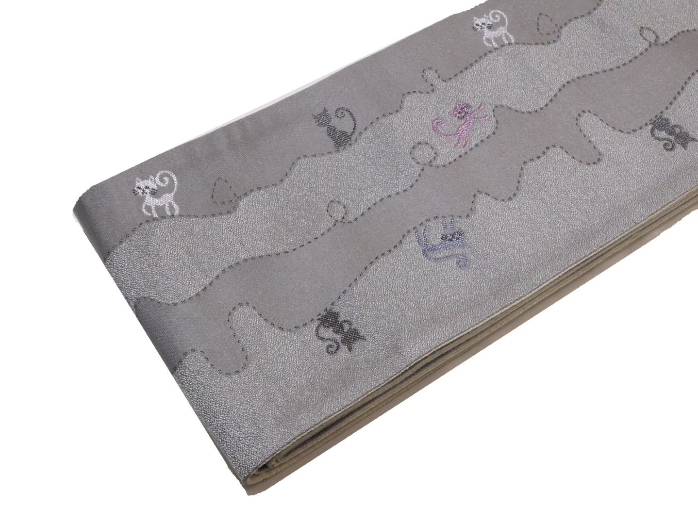 絹交織博多織半幅帯「黒色の地にグレー色、赤色、紫色の格子模様」