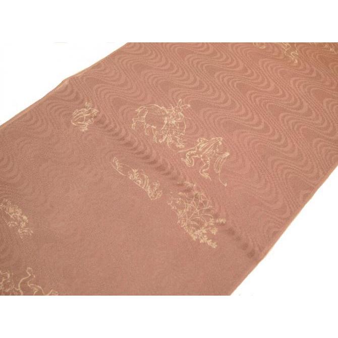 ・夏物正絹帯揚げ「フジ紫色の地にピンクベージュ色の鳥獣戯画の柄」