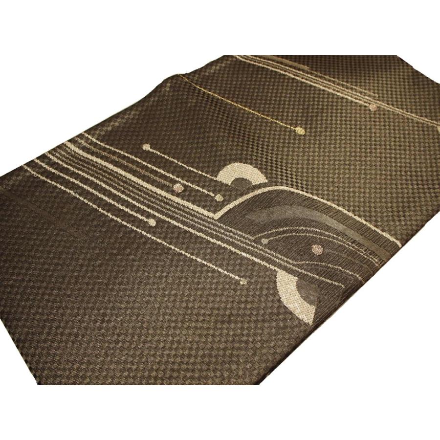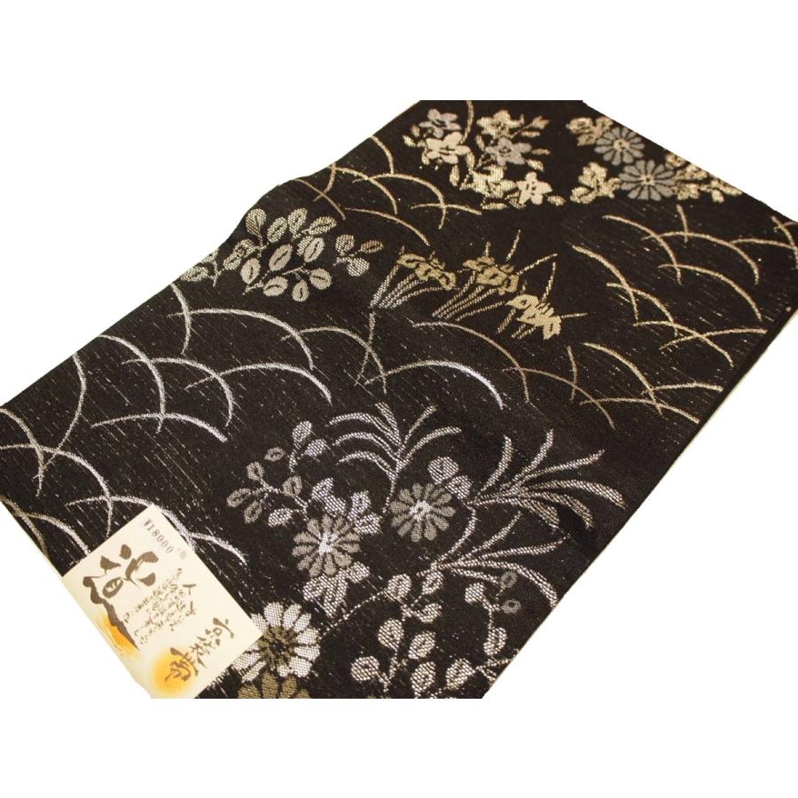 夏物ポリエステル京袋帯「黒色の地に銀色のつゆしば、桔梗、萩、菊」